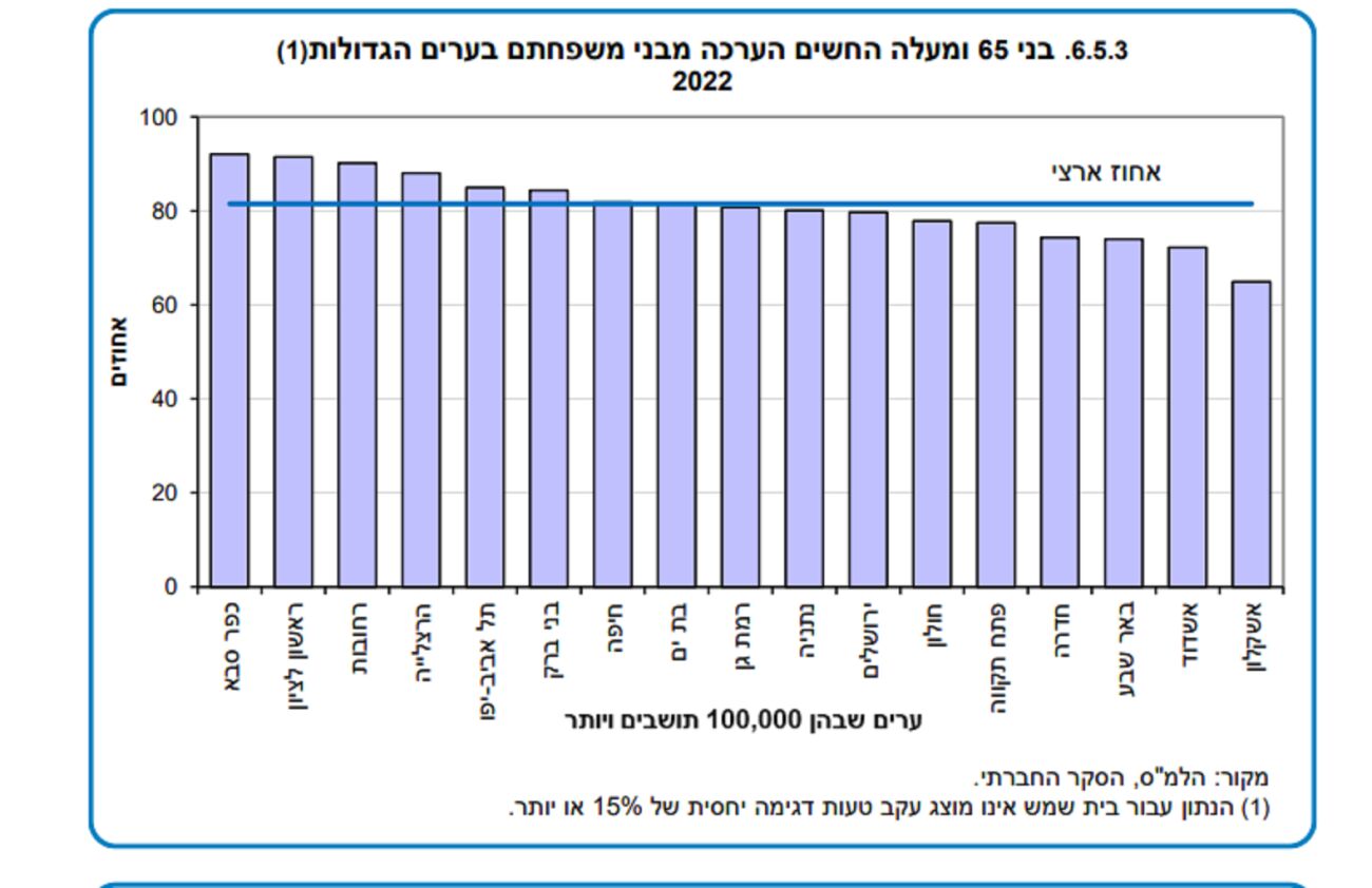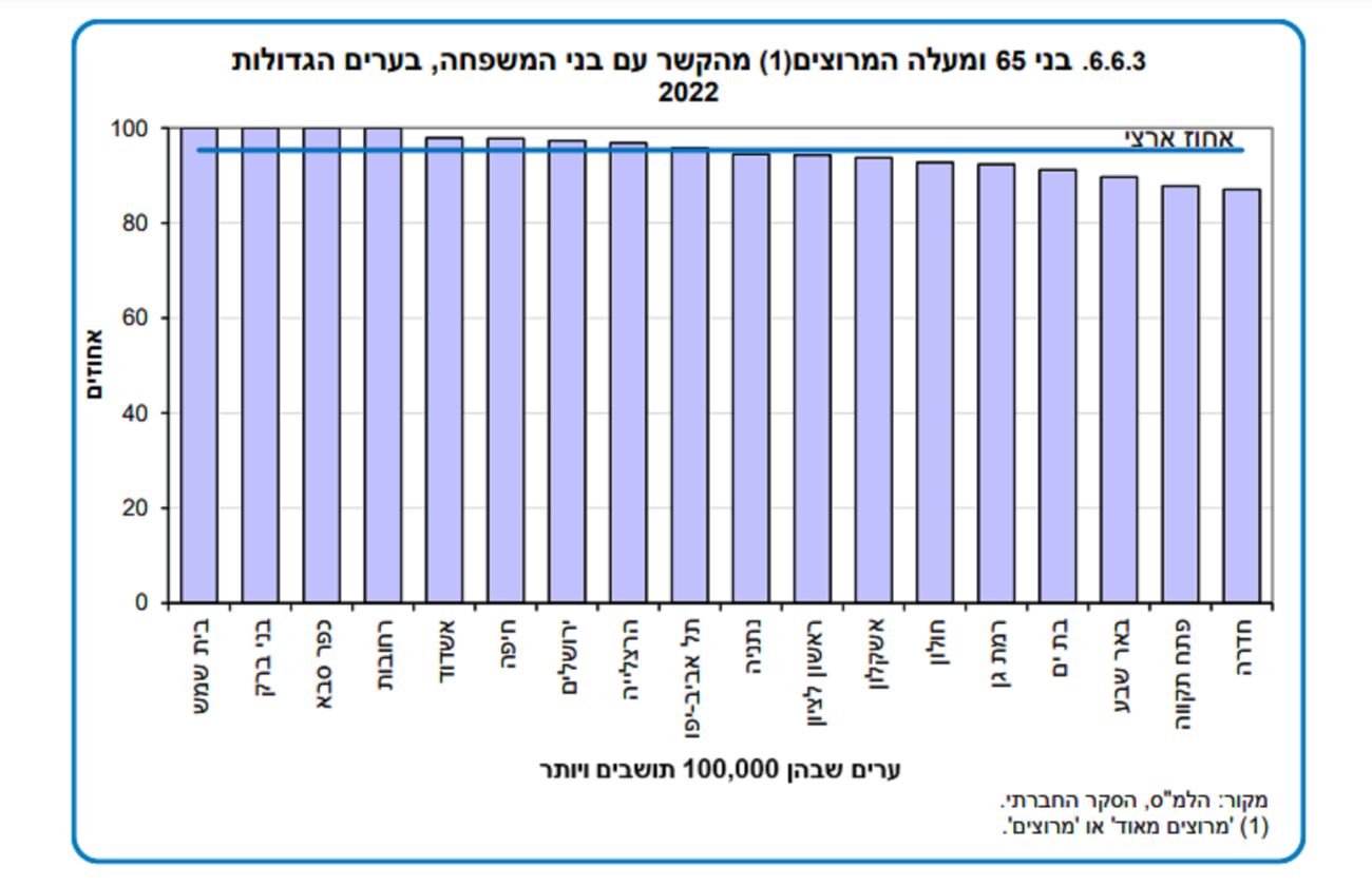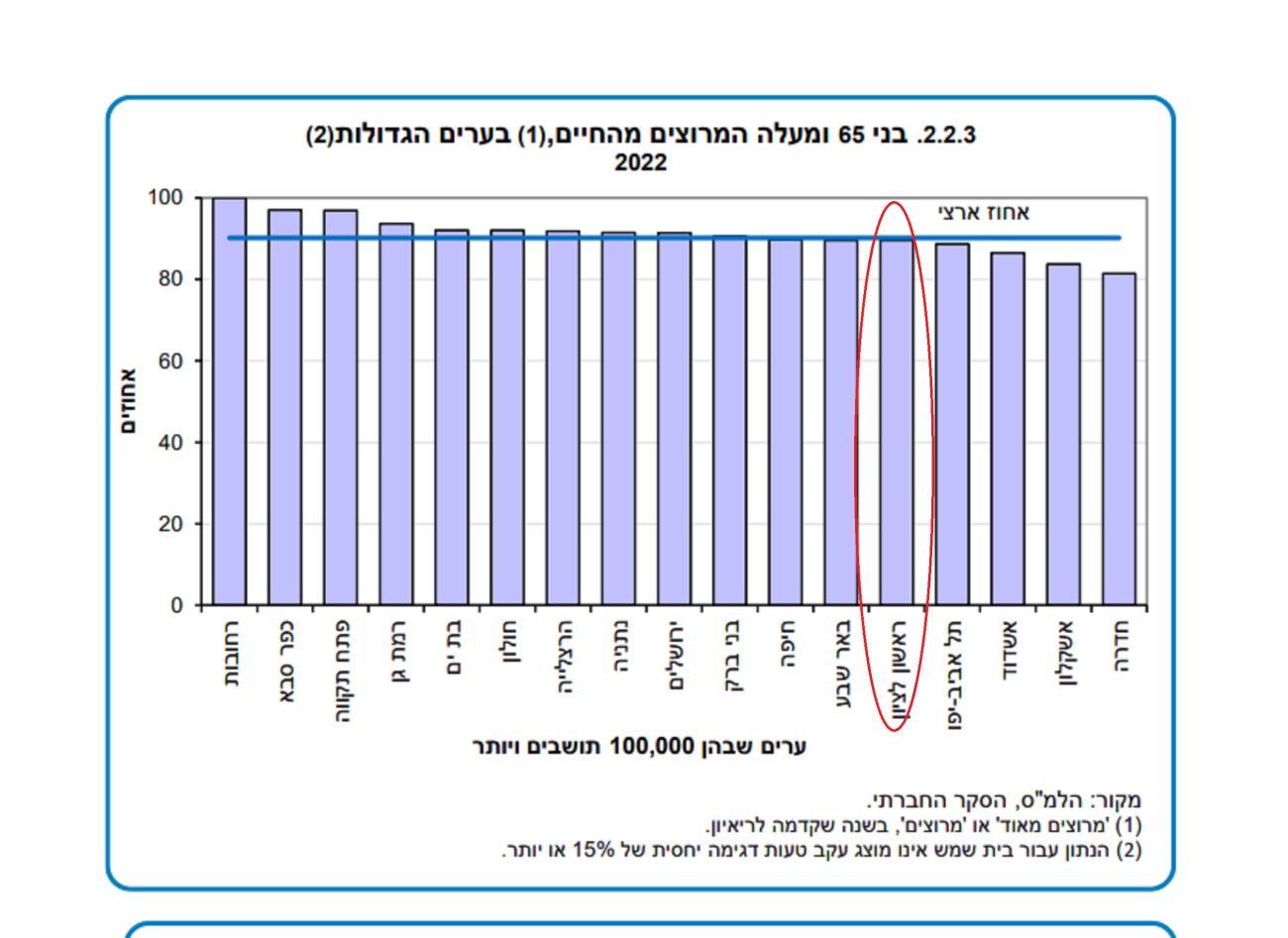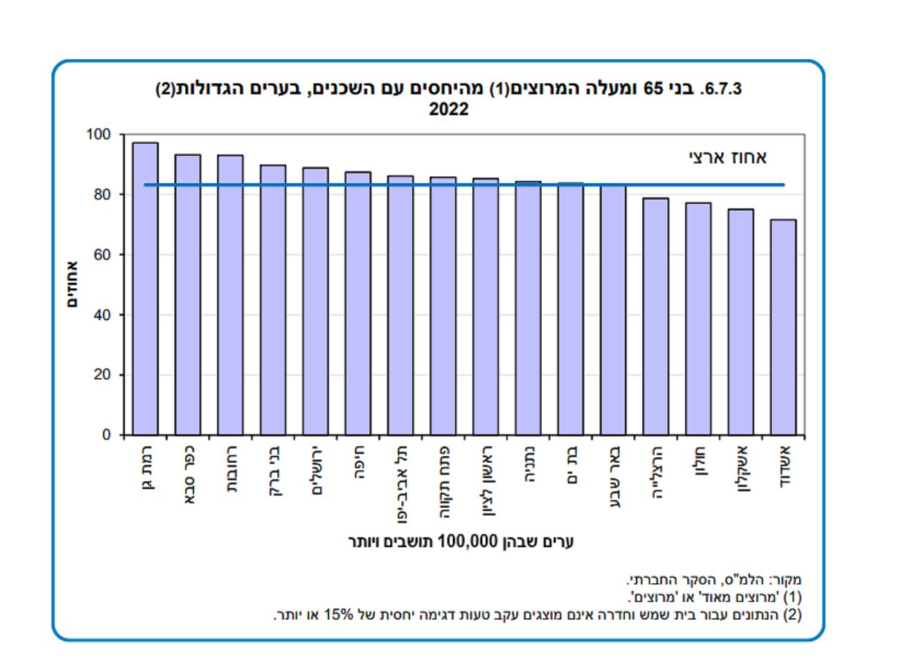כך עולה מנתוני הלמ"ס המפרסמת את דו"ח המדדים הלאומיים להזדקנות מיטבית בישראל וסוקר את מצב של האוכלוסייה המבוגרת. מבחינה חברתית רוב האזרחים הותיקים בעיר הביעו שביעות רצון גדולה מהחיים שלהם והקשר שלהם עם בני המשפחה והשכנים