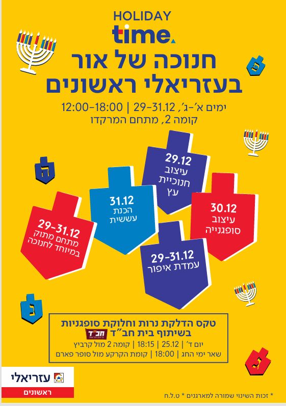 טקסי הדלקת נרות וחלוקת סופגניות יתקיימו ביום רביעי 25.12 בשעה 18:15 בקומה 2 מול קרביץ. בשאר ימי החג הטקסים יתקיימו בשעה 18:00 בקומת הקרקע מול סופר פארם