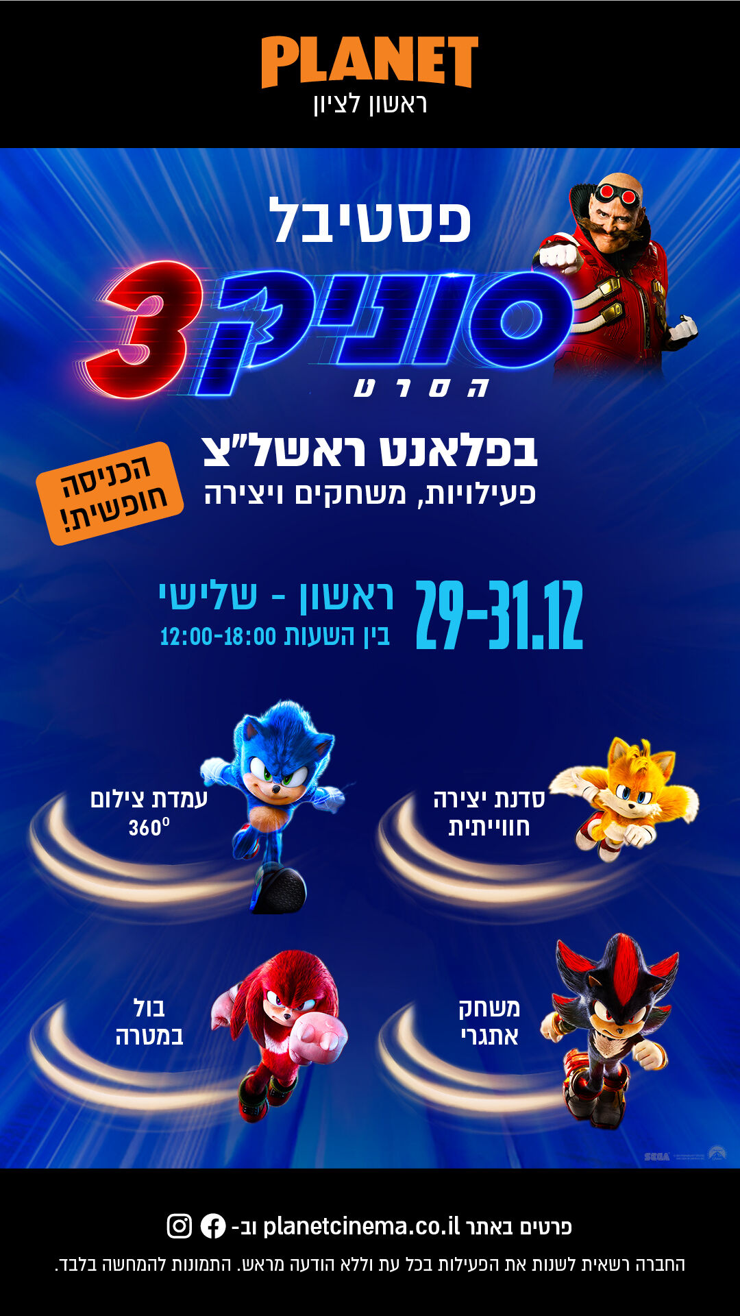 Planet, רשת בתי הקולנוע תקיים פסטיבל 'סוניק' לכל המשפחה, בהשראת הסרט "סוניק 3", אשר יהיה זמין לצפייה בכל מתחמי הקולנוע של הרשת ברחבי הארץ. הפסטיבל יתקיים במתחמי הרשת בראשון לציון וירושלים, כשלושה ימים לאחר עליית הסרט השלישי בבתי הקולנוע ב-26 בדצמבר, בימים ראשון עד שלישי, 29-31 בדצמבר.