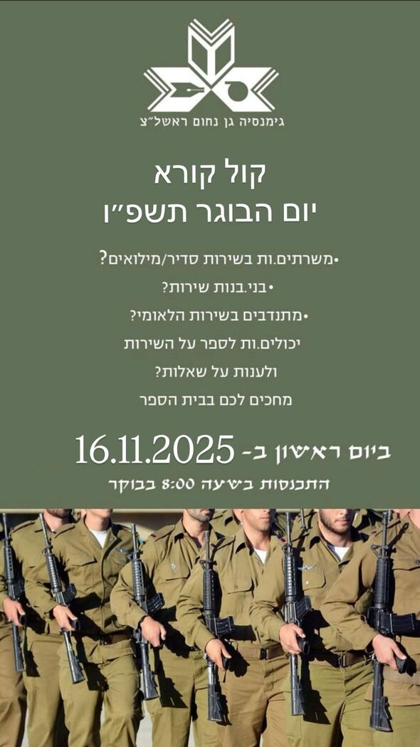 מקיף ד' - גימנסיה גן נחום מזמין את בוגריו ליום הבוגר המסורתי 'מדברים מהשטח' שיתקיים ביום ראשון, 16.11.25