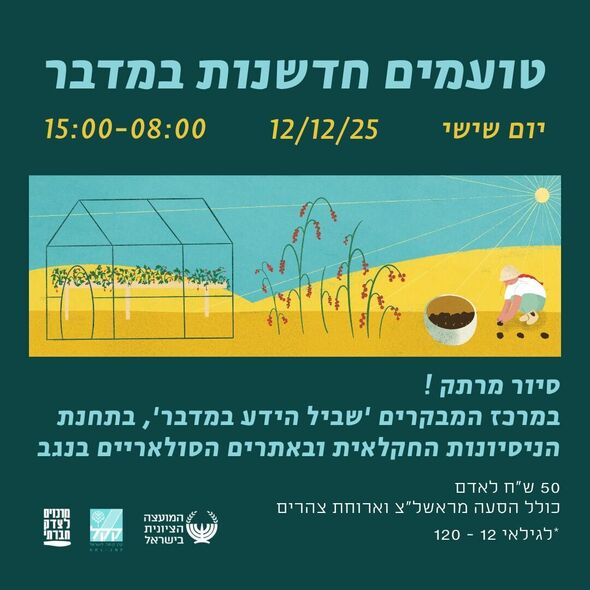 סיור מרתק תחת הכותרת "טועמים חדשנות במדבר" יוצע לציבור ביום שישי, 12 בדצמבר 2025, בין השעות 8:00 ל-13:00. הסיור כולל הסעה מראשון לציון וארוחת צהריים.