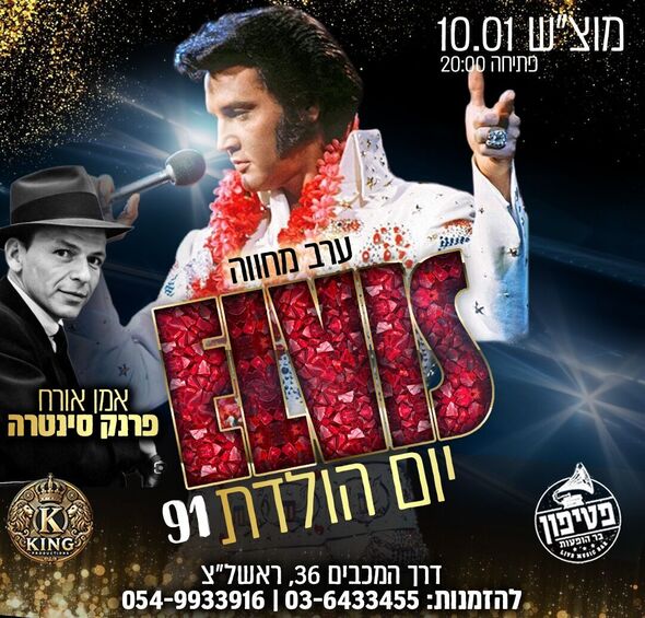 מועדון הפטיפון בראשון לציון יציין את יום הולדתו ה-91 של אלביס פרסלי בערב מחווה מיוחד שיתקיים ב-10 בינואר בשילוב מחווה לפרנק סינטרה