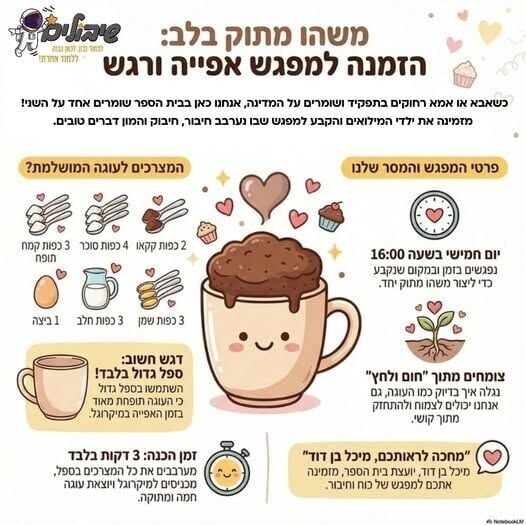 במסגרת הפעילות שזכתה לשם "משהו מתוק בלב", בהובלת יועצת בית הספר מיכל בן דוד וצוות ההוראה, תלמידי בית הספר מוזמנים לאפות יחד עוגת ספל אישית במיקרוגל. הרעיון שעומד מאחורי הפעילות הוא להעביר לילדים מסר מעצים ולפיו ניתן "לצמוח מתוך חום ולחץ", ממש בדומה לתהליך התפיחה והאפייה של העוגה בספל.