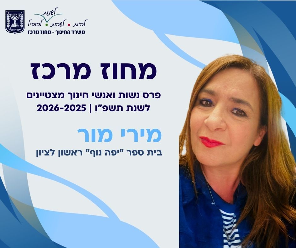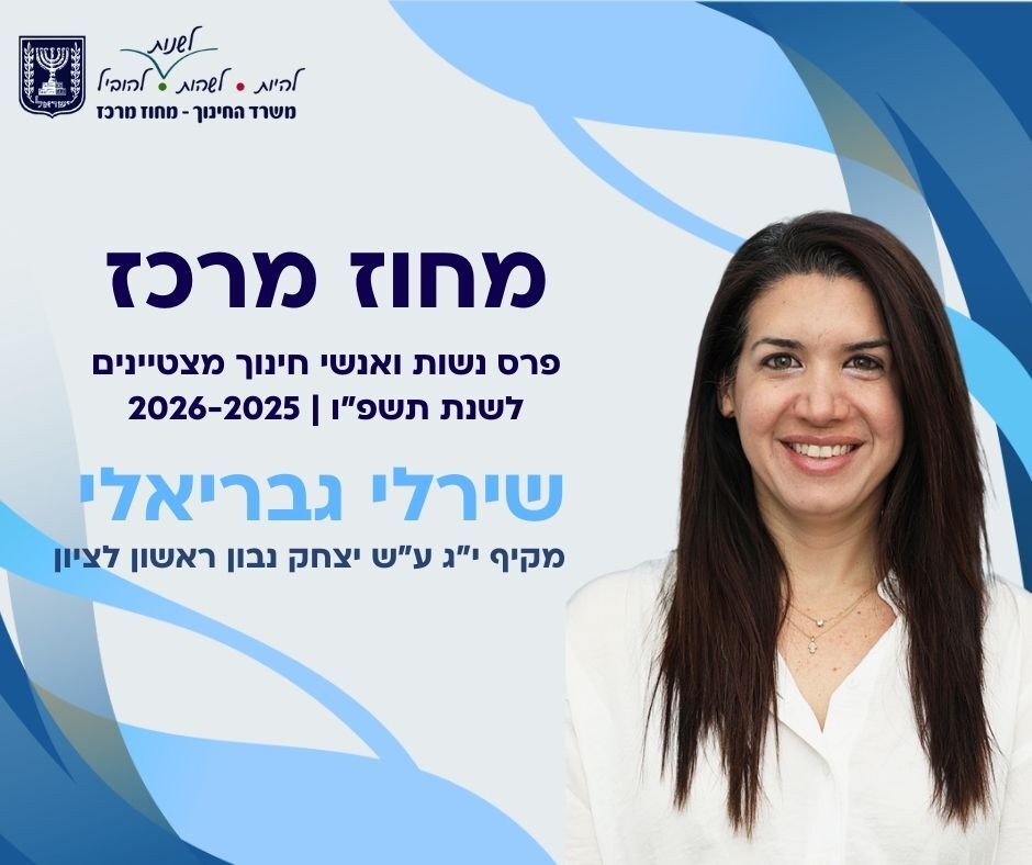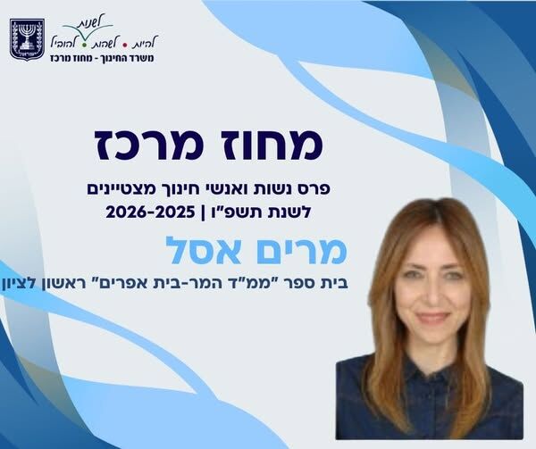 מחוז מרכז במשרד החינוך הכריז על זכייתם של אנשי ונשות חינוך מצטיינים לשנת תשפ"ו. הזוכים נבחרו בשל הובלת עשייה חינוכית יוצאת דופן, ערכית וחדשנית למען תלמידי ישראל ולמען החברה כולה. בפרס המחוזי זכו שלוש נציגות מהעיר ראשון לציון.