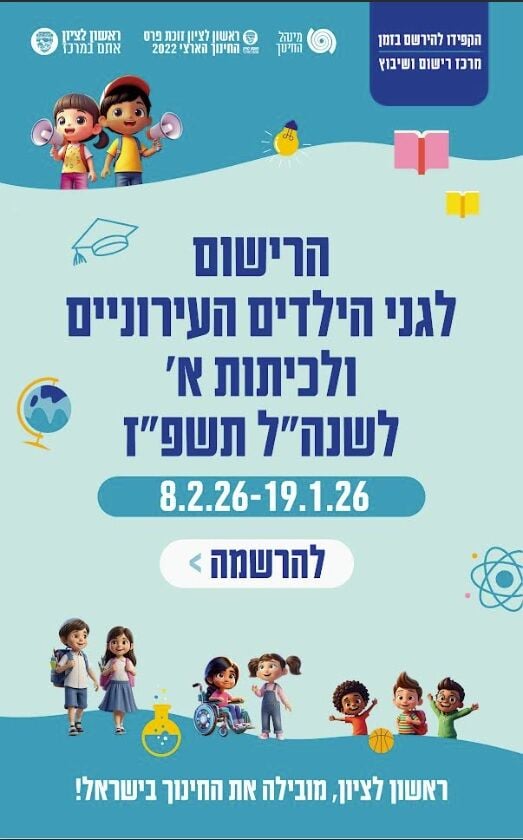 עיריית ראשון לציון נערכת לשנת הלימודים תשפ"ז ומודיעה כי היום שני, ה-19.1.26, החל מהשעה 8:00 בבוקר, ייפתח הרישום לגני הילדים העירוניים ולכיתות א'. הרישום יתבצע באופן מקוון באמצעות אתר הרישום שיהיה זמין 24 שעות ביממה, ויימשך כשלושה שבועות, עד ליום ראשון ה-8.2.26.