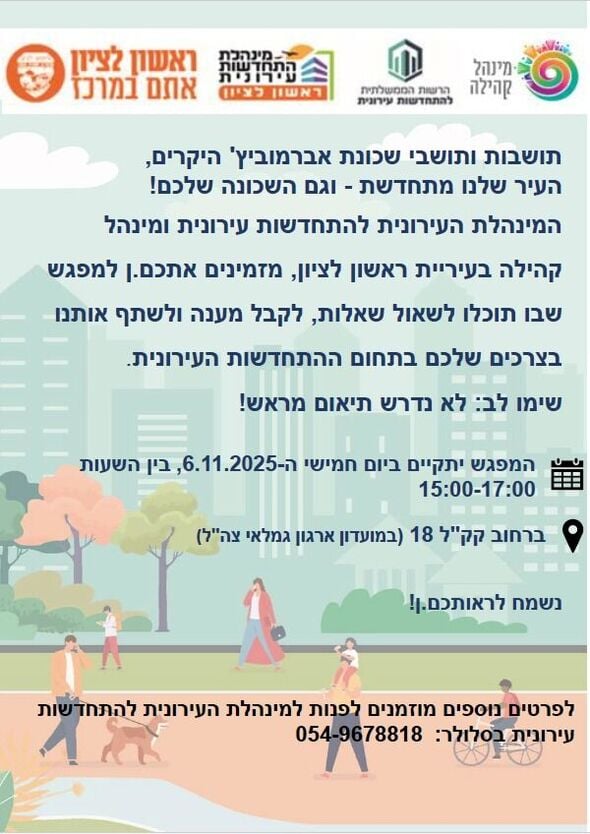 עיריית ראשון לציון ומנהלת ההתחדשות העירונית מזמינה את תושבי שכונת אברמוביץ למפגש מיוחד בהתחדשות עירונית בשכונה.