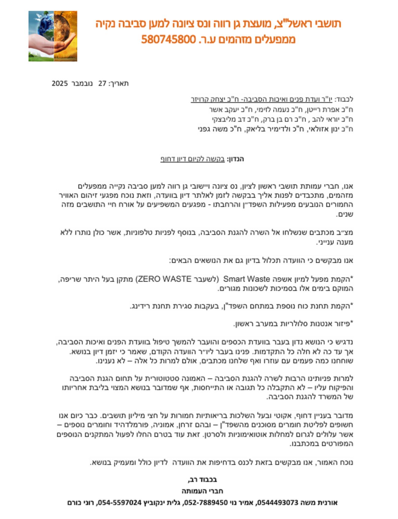 במכתב לחברי הועדה נכתב: "מדובר בעניין דחוף ואקוטי ובעל השלכות בריאותיות על חצי מיליון תושבים. נוכח האמור אנו מבקשים בזאת לכנס בדחיפות את הוועדה לדיון כולל ומעמיק בנושא".