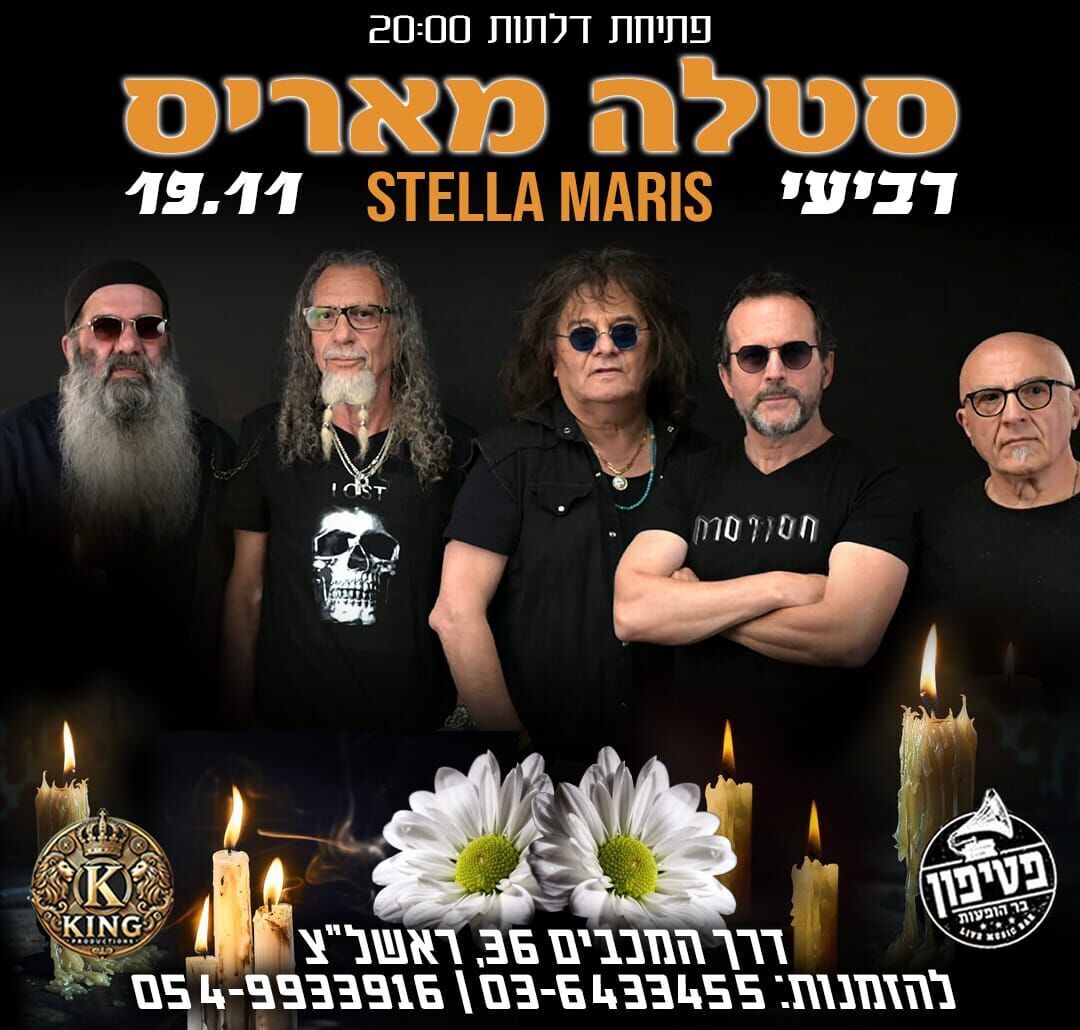להקת הרוק הוותיקה "סטלה מאריס" תגיע להופעה בפטיפון בר בראשון לציון ביום רביעי, 19 בנובמבר, בשעה 20:00. הלהקה, הפעילה משנת 1992, נחשבת לאחת מאגדות הרוק של שנות התשעים בישראל.