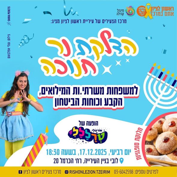 ביום רביעי 17.12 יתקיים אירוע חנוכה למשפחות משרתי/ות המילואימניקים, הקבע וכוחות הביטחון בלובי עיריית ראשון לציון - לינק להרשמה בכתבה