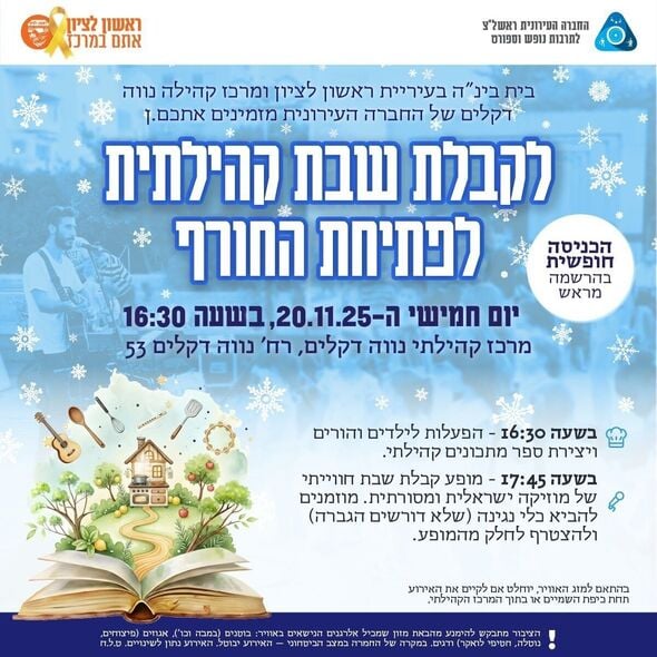עיריית ראשון לציון מזמינה את התושבים לקבלת שבת קהילתית לפתיחת החורף בחמישי 20.11 שתכלול הפעלות לילדים ומופע מוזיקלי