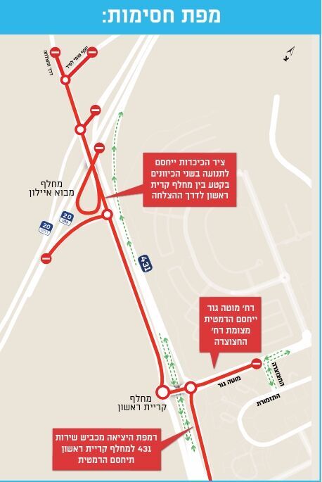 - רמפת היציאה מכביש השירות (431) אל מחלף קריית ראשון תיחסם לתנועה.
