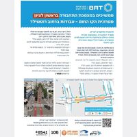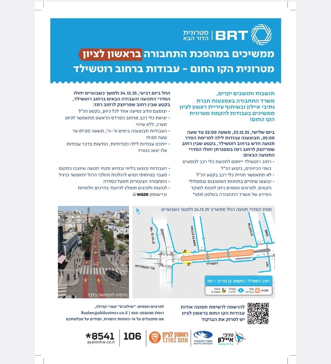 החל מיום רביעי, ה-24.12.25, ולמשך תקופה של כחצי שנה, יחולו הסדרי תנועה חדשים ברחוב רוטשילד בקטע שבין שפרינצק לרמז. במסגרת זו יצומצם נתיב נסיעה לנוסעים בשני הכיוונים. העבודות יתבצעו בימים א'-ה', בין השעות 07:00 ל-19:00. ייתכנו עבודות לילה נקודתיות נוספות, עליהן תפורסם הודעה בנפרד.