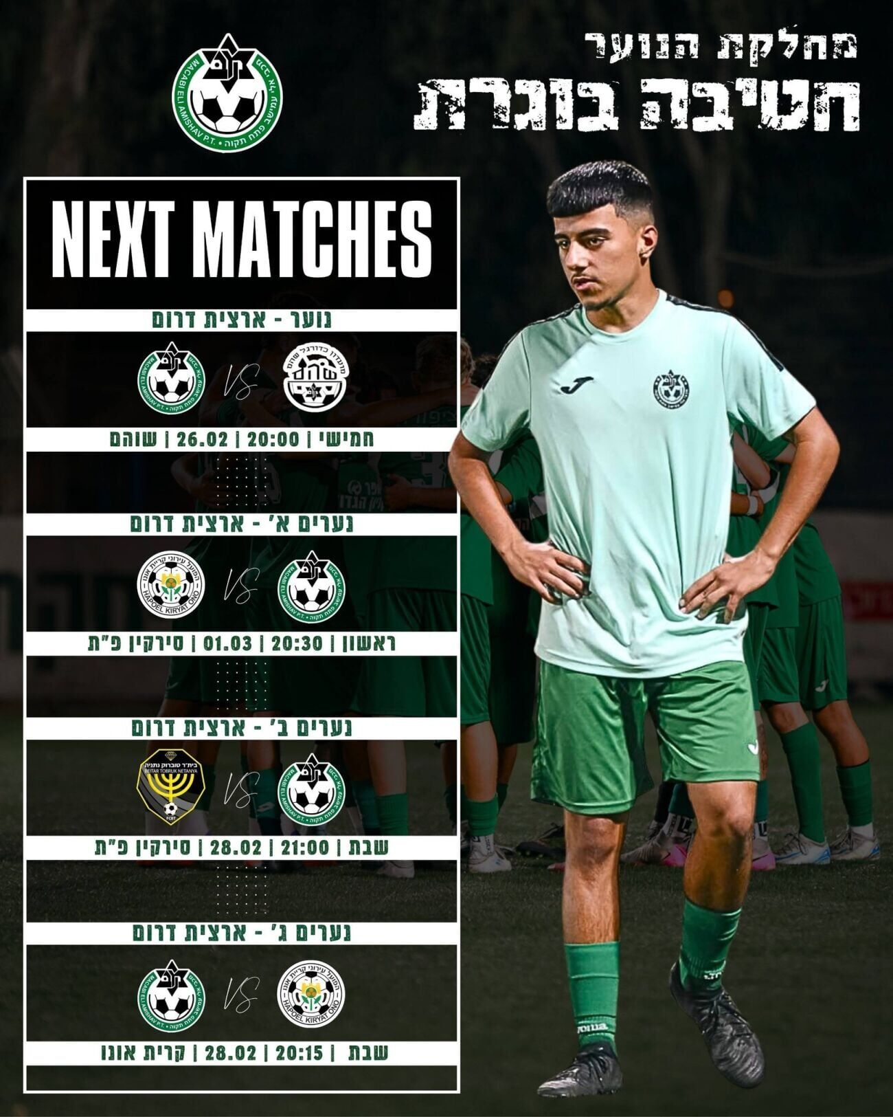 קבוצת טרום א' תתארח למשחק מול מכבי ראשון לציון ביום שישי (27.02) בשעה 13:45 בראשון לציון. קבוצת ילדים ב' תארח את מועדון כדורגל מכבי נתניה ביום שבת (28.02) בשעה 19:15 בסירקין פ"ת. ביום ראשון (01.03) בשעה 17:00, תארח קבוצת ילדים ג' את הפועל ירושלים במגרש סירקין. בהמשך השבוע, קבוצת ילדים א' תשחק בחוץ מול מכבי באר שבע ביום שלישי (03.03) בשעה 17:00, וקבוצת טרום ב' תתמודד גם היא בבאר שבע מול הפועל המקומית ביום רביעי (04.03) בשעה 11:00.