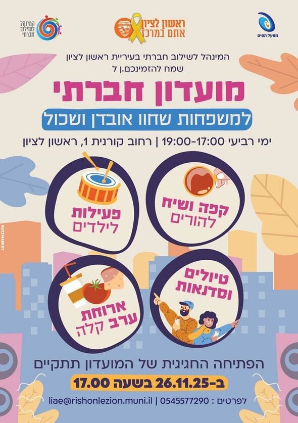 המינהל לשילוב חברתי בעיריית ראשון לציון יחנוך מועדון חברתי למשפחות שחוו אבדן ושכול ברביעי 26.11 עם הפנינג חגיגי לילדים ולהורים