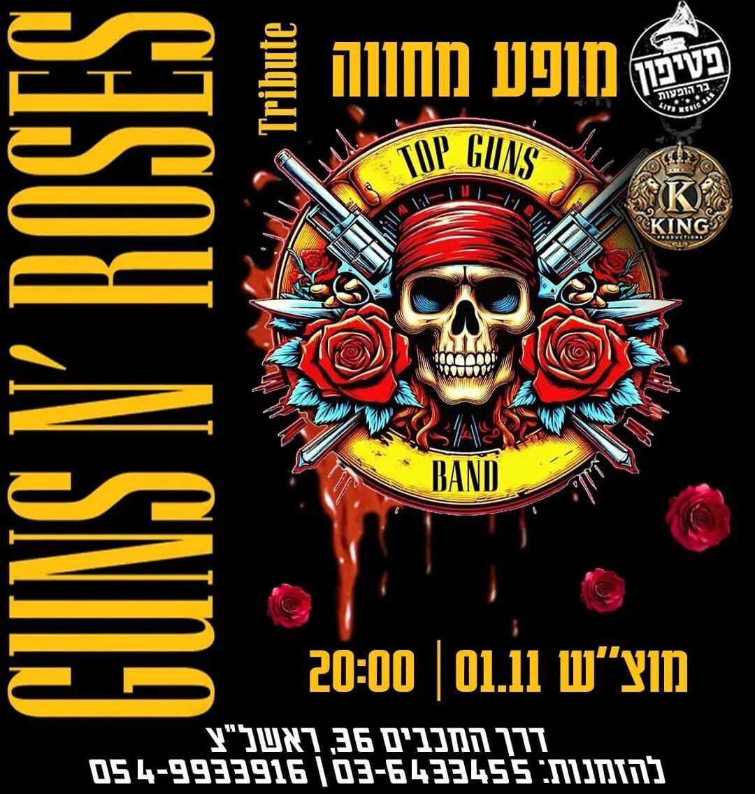 להקת TOP GUNS BAND תגיע לראשון לציון למופע מחווה מחשמל ללהקת הרוק Guns N' Roses. האירוע יתקיים בפטיפון בר במוצאי שבת, 1 בנובמבר, בשעה 21:30.דרך המכבים 36 בראשון לציון