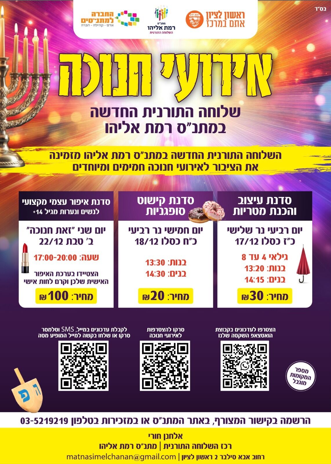 הרשמה בקישור המצורף, באתר המתנ"ס, או במזכירות בטלפון 03-5219219:
