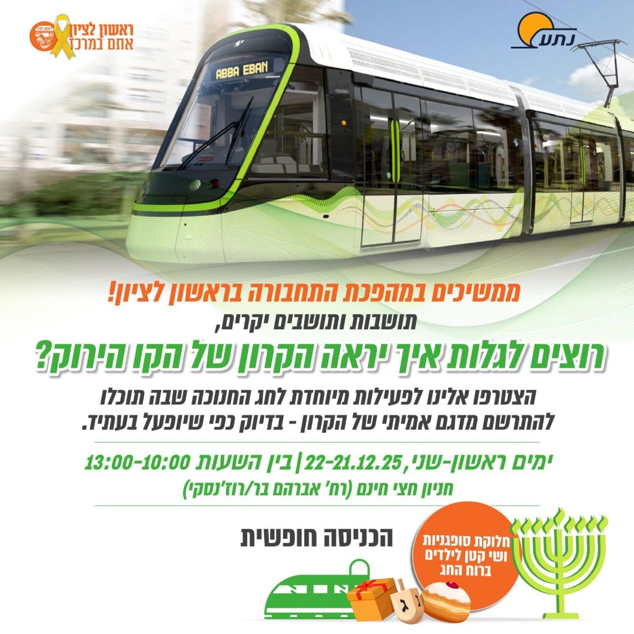 הפנינג חנוכה חגיגי בקרון לדוגמה של הרכבת הקלה של הקו הירוק!