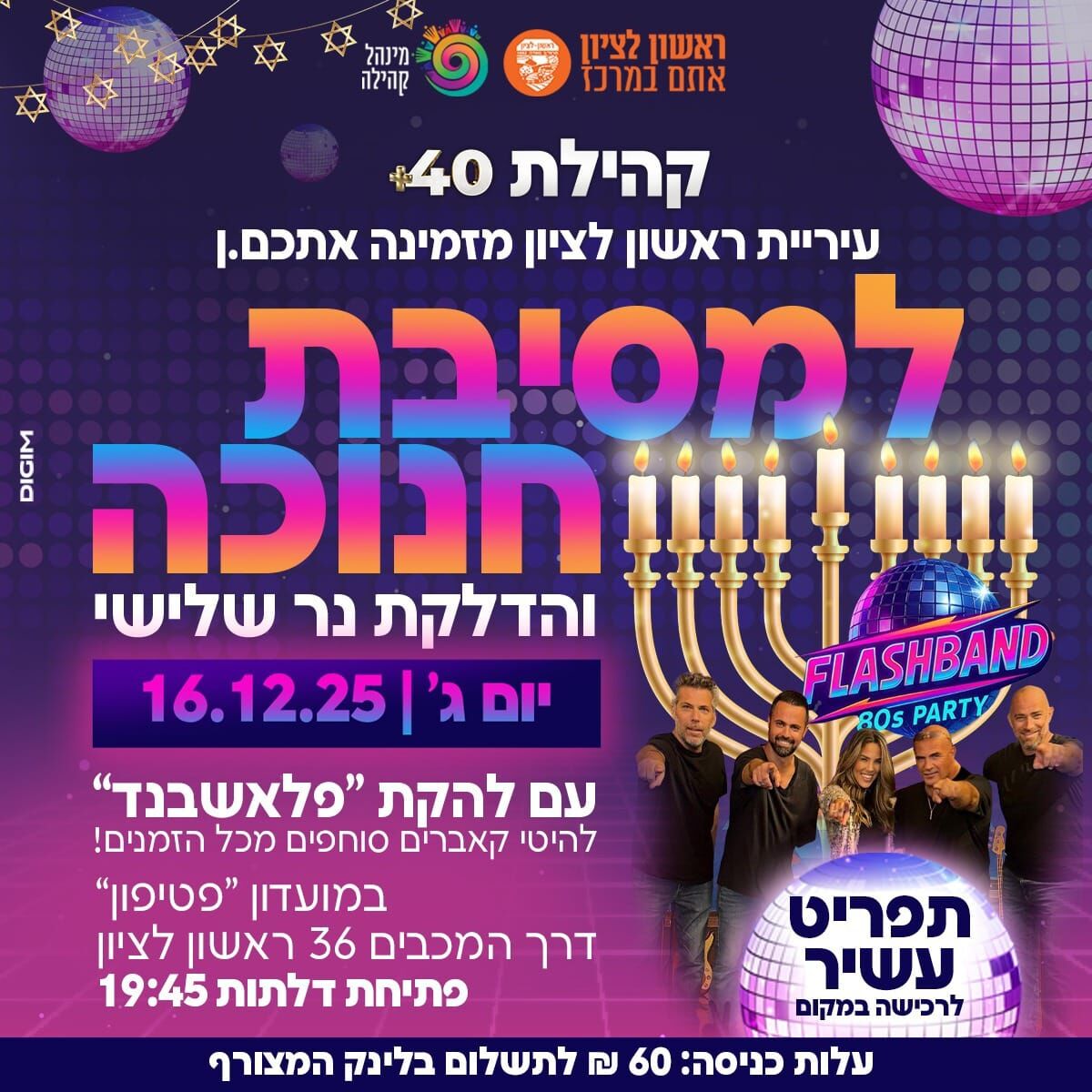 מסיבת חנוכה לקהילת 40+: עם להקת ״פלאשבנד״ במועדון "פטיפון". בשעה 21:15, דרך המכבים 36. מחיר: 60 ₪.