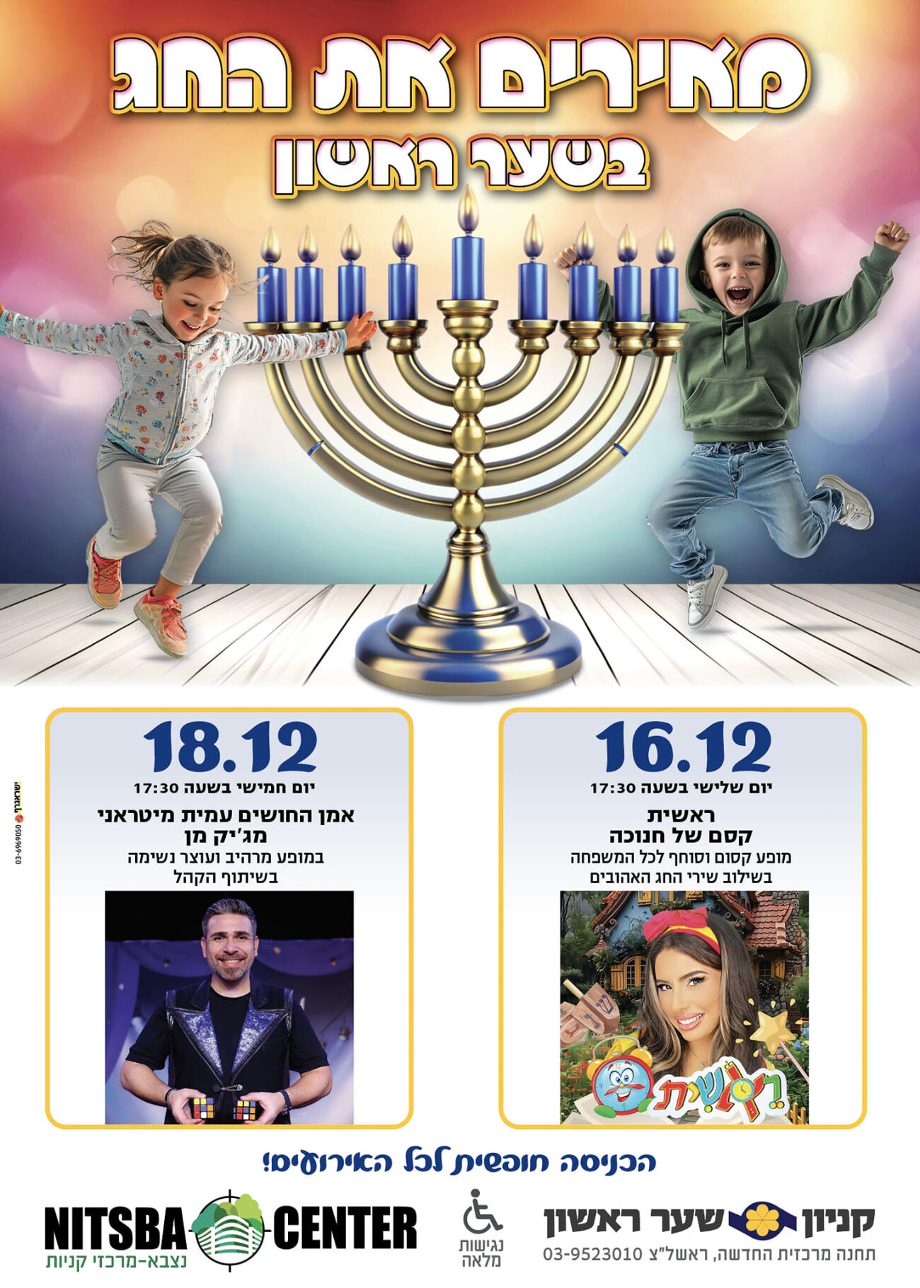 טקסי הדלקת נרות חנוכה בשיתוף בית חב"ד יתקיימו בימים א'-ה' (לא כולל שישי ושבת) בשעה 18:30 ברחבת האירועים בקומה 2. בסיום כל מופע תתקיים חלוקת סופגניות (עד גמר המלאי).