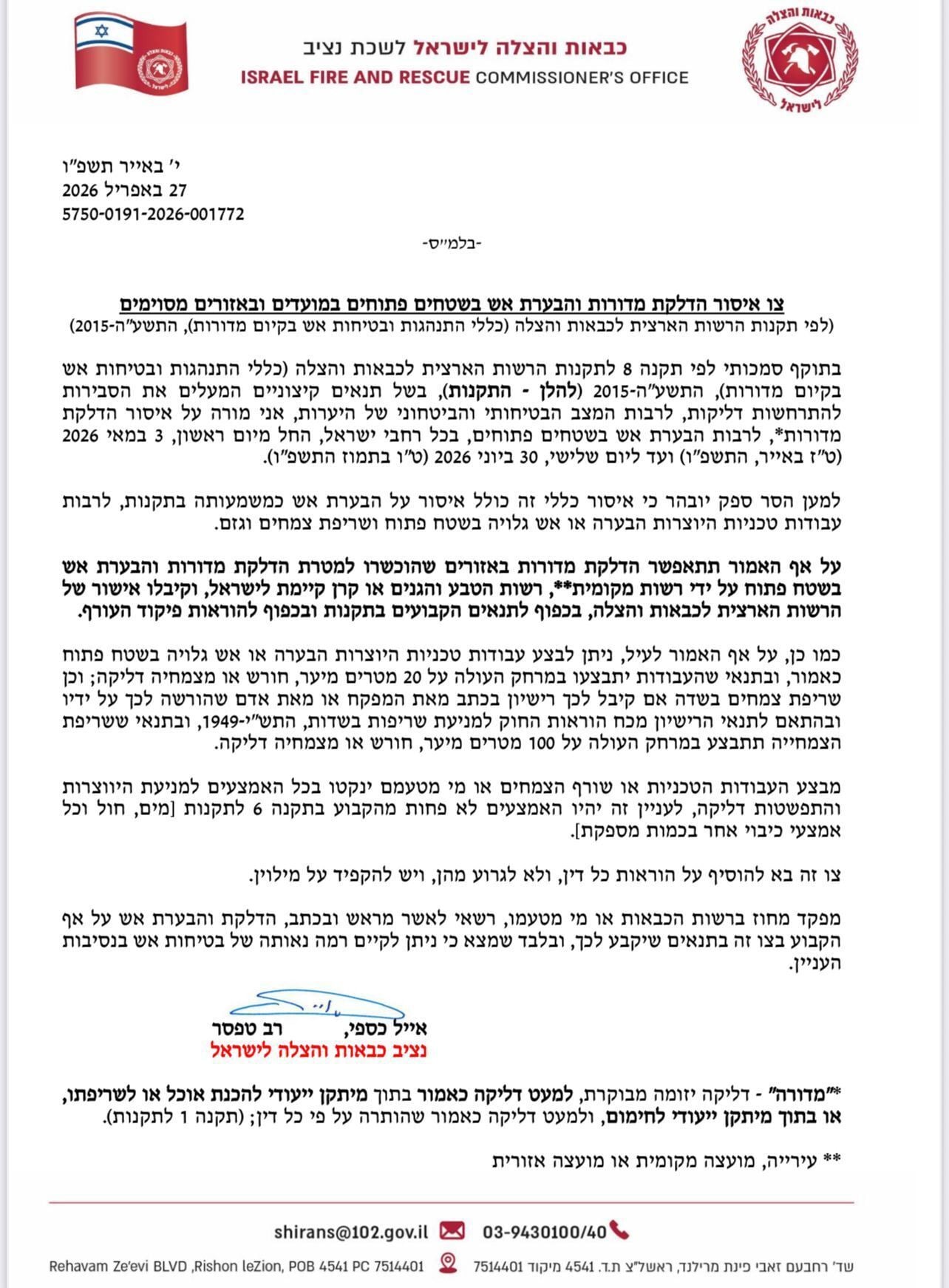 האיסור על הדלקת מדורות בל"ג בעומר כבר הפך למסורת וגם השנה מכבי האש מוציא צו איסור הדלקת מדורות בשטחים הפתוחים בכל רחבי ישראל.