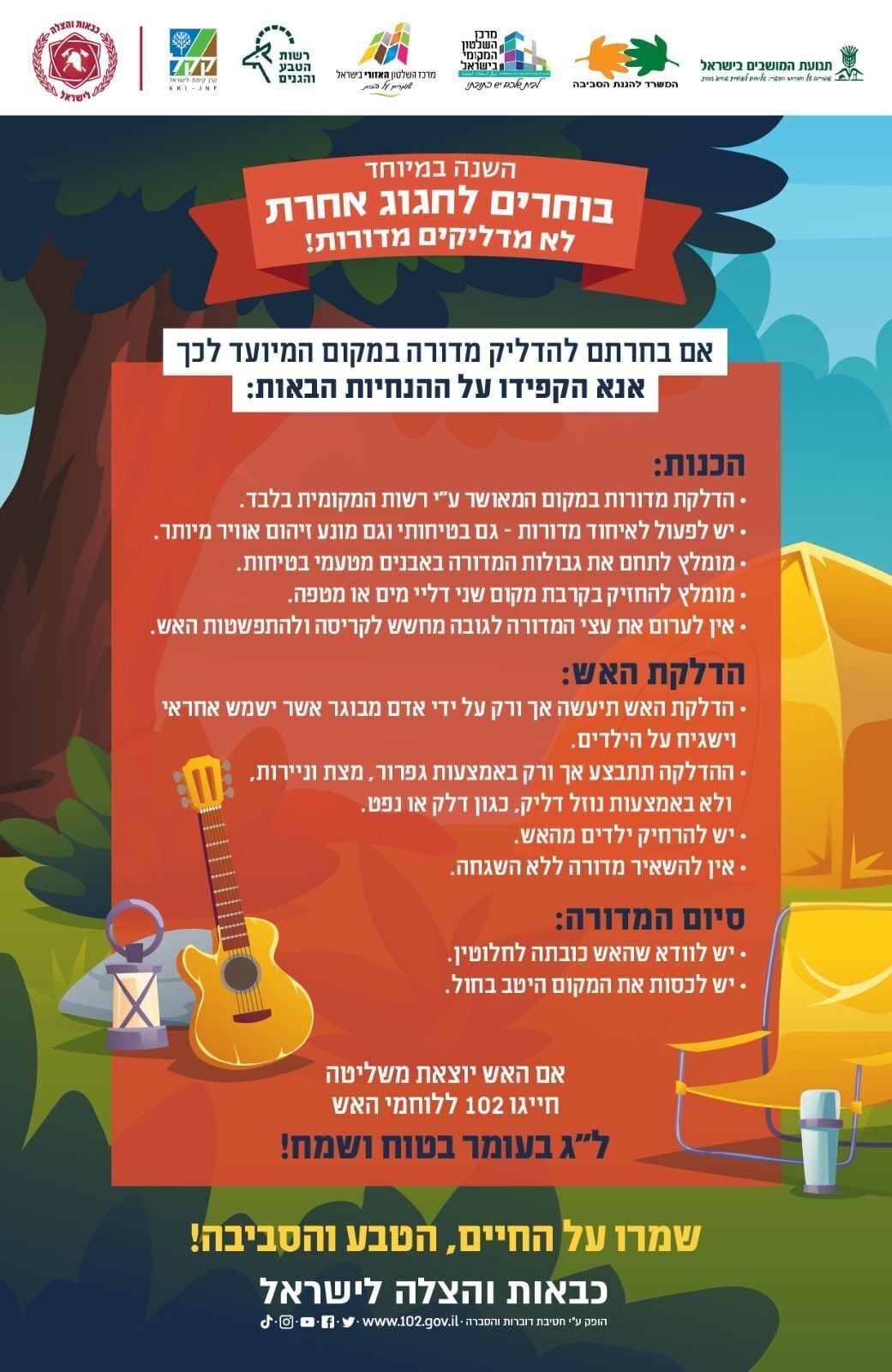 הדלקת מדורות תותר רק באזורים שרשות מקומית או רשות הטבע והגנים הכשירו לכך במיוחד ואישרו אותם מראש מול הכבאות.