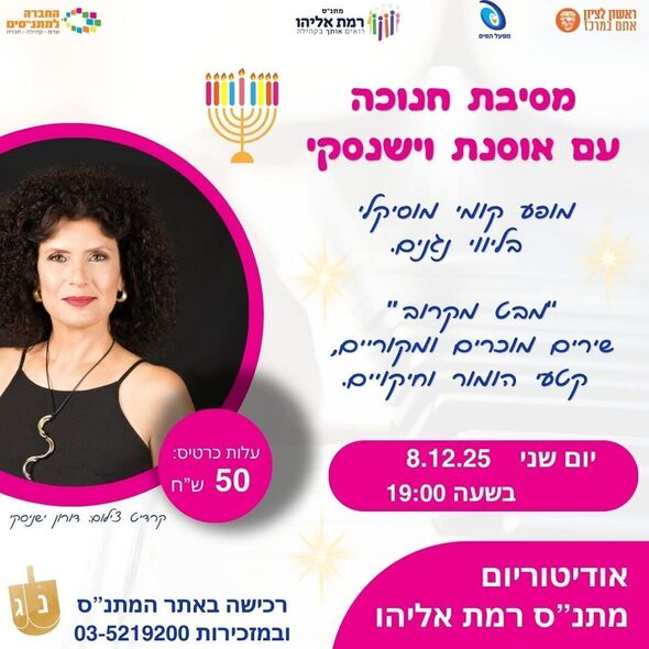מסיבת חנוכה בשני 8.12: אוסנת וישינסקי בערב קומי-מוזיקלי עם שירים, הומור וחיקויים במתנ"ס שיכוני המזרח ראשון לציון