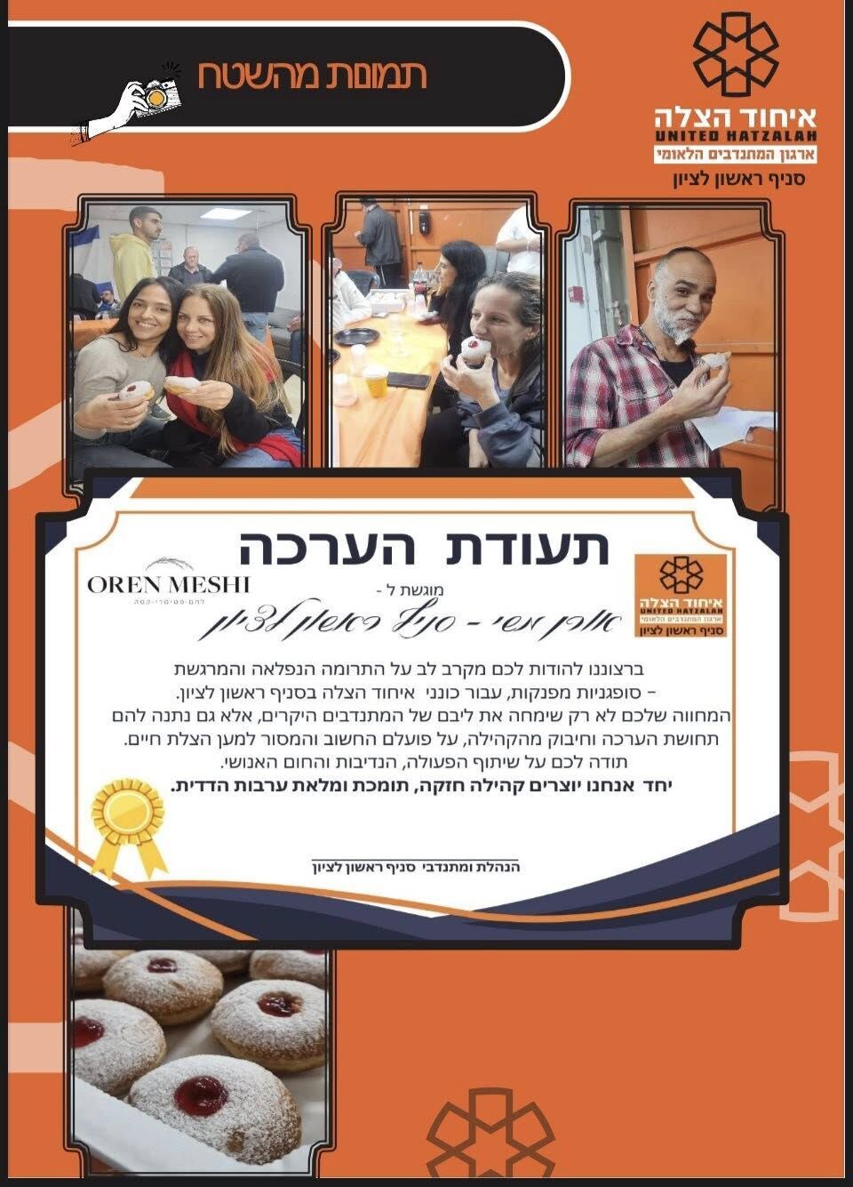מחווה מחממת לב נרשמה בסניף איחוד הצלה בראשון לציון, כאשר אורן מבית העסק "משי ראשון לציון" תרם סופגניות למתנדבי הארגון.