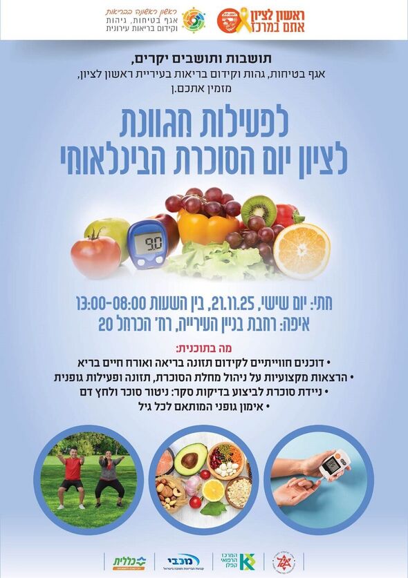 האגף לבטיחות, גהות וקידום בריאות בעיריית ראשון לציון יקיים הפנינג חווייתי ומעשיר לציון יום הסוכרת העולמי. האירוע פתוח לקהל הרחב ויתקיים ביום שישי, 21 בנובמבר 2025, בין השעות 08:00 ל-13:00, ברחבת בניין העירייה ובתוכו, ברחוב הכרמל 20.