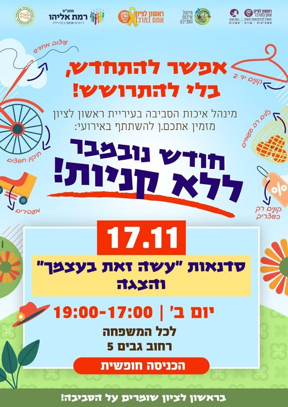 עיריית ראשון לציון, באמצעות מינהל איכות הסביבה ומינהל קהילה, מזמינה את התושבים להשתתף בהפנינג חגיגי בסימן "נובמבר ללא קניות". האירוע מתקיים בשיתוף הנוער הירוק.