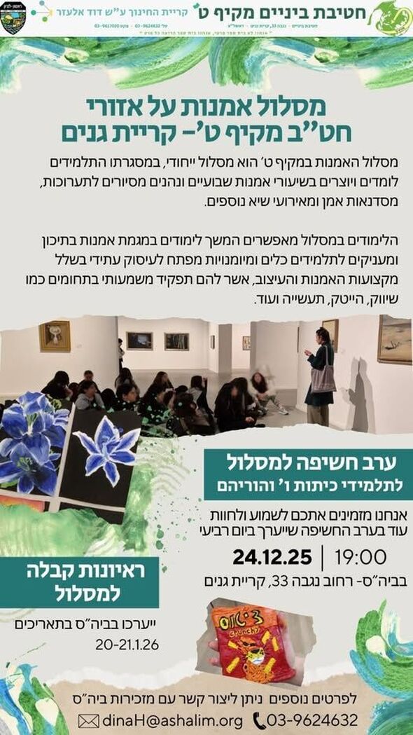 ביום רביעי 24.12 יקיים מקיף ט בראשון לציון ערב חשיפה למסלול האמנות להורים ותלמידים כיתות ו