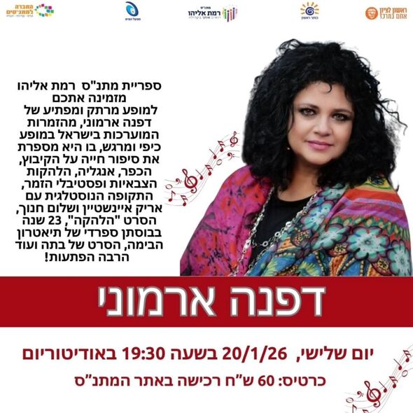 הזמרת והיוצרת המוערכת דפנה ארמוני תגיע למתנ"ס רמת אליהו לערב תרבותי מיוחד. במסגרת האירוע, הקהל יוזמן למופע מרגש ומפתיע הכולל סיפורים, שירים, קטעים מוזיקליים ורגעים של נוסטלגיה ישראלית.