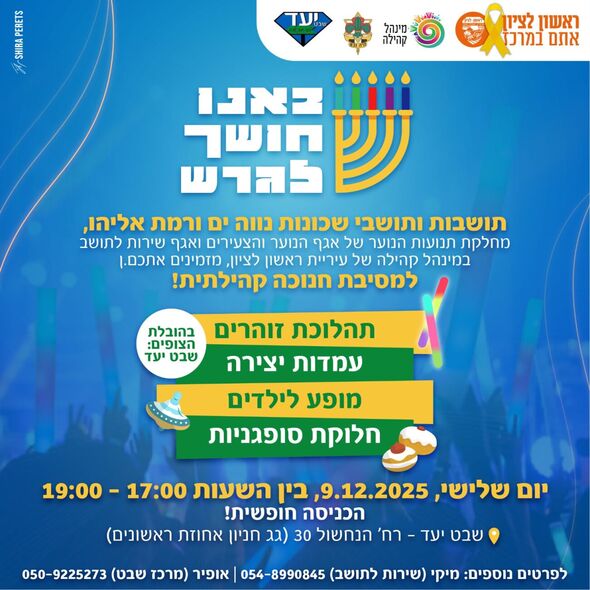 מינהל קהילה בעיריית ראשון לציון מזמין את תושבי שכונות רמת אליהו ונווה ים לתהלוכת זוהרים ומסיבת חנוכה.
