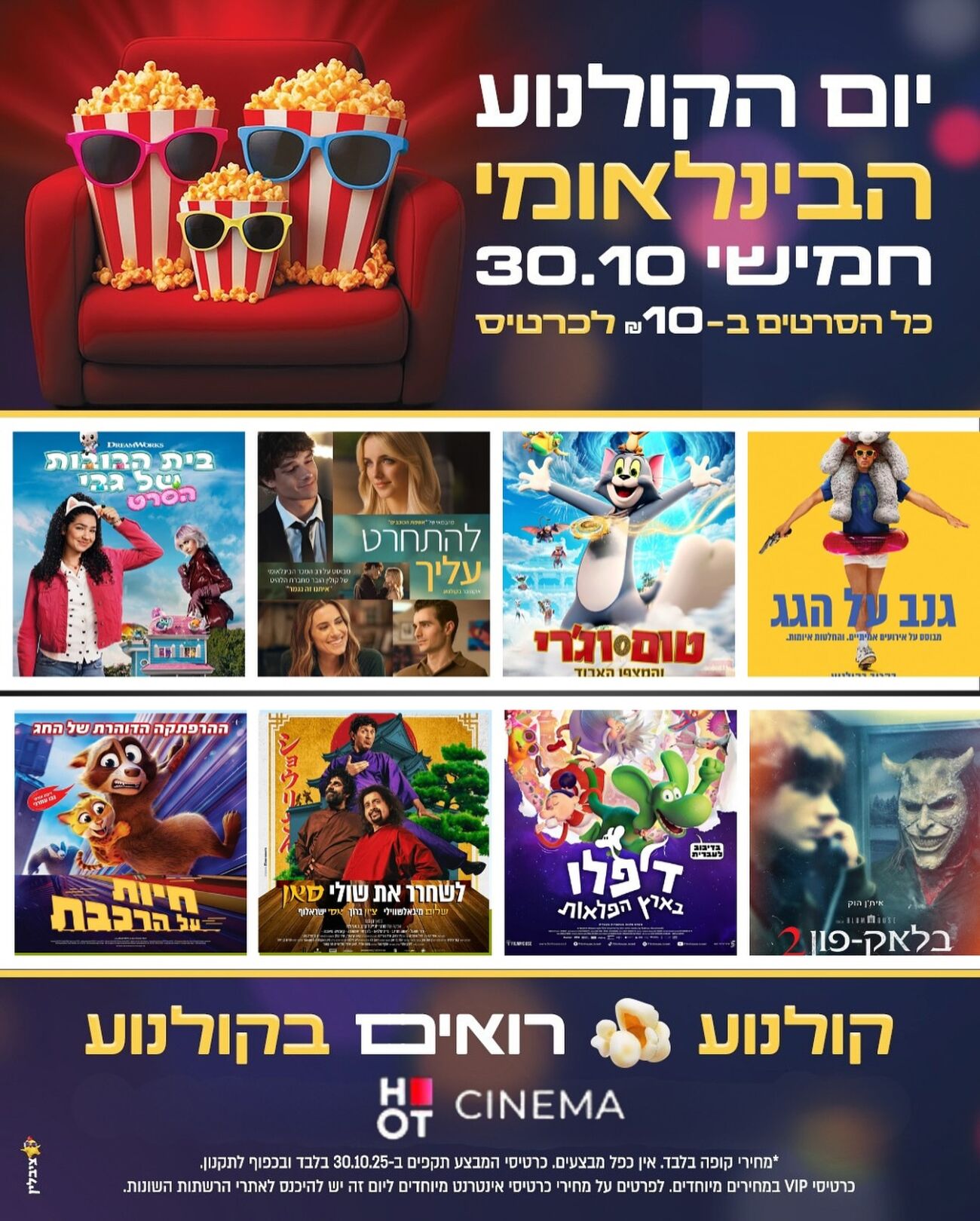 יום הקולנוע יחול גם בהוט סינמה ברחבי הארץ הכוללות את סניפי רחובות ופתח תקווה ויציעו סרטים 10 ש"ח.