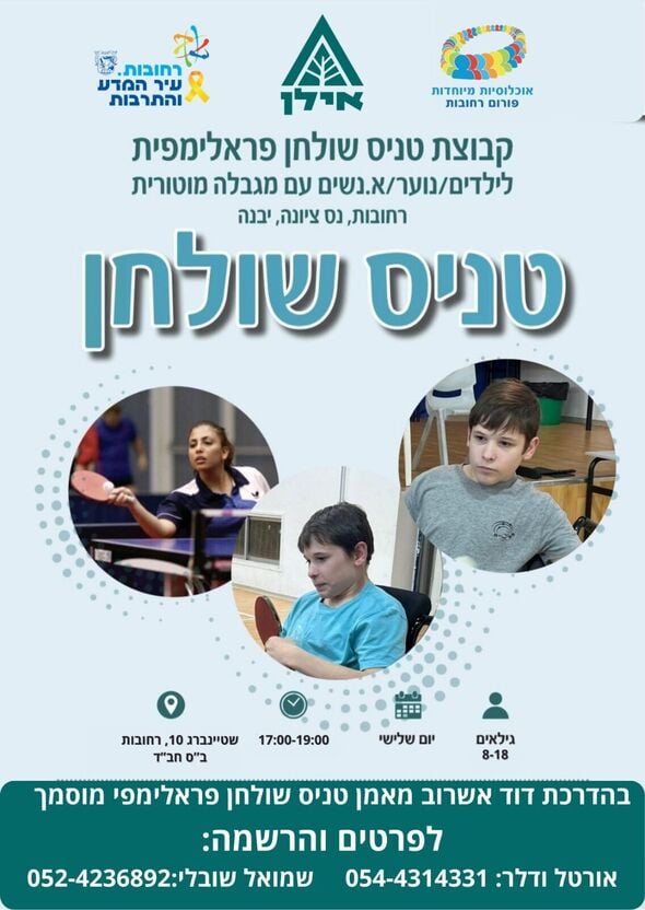 עמותת איל"ן הודיעה על פתיחת ההרשמה לקבוצת טניס שולחן פראלימפי מקצועית, המיועדת לילדים, מתבגרים ובוגרים המתמודדים עם מגבלה מוטורית. הפעילות נועדה לספק מסגרת ספורטיבית ומקצועית למשתתפים.