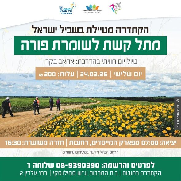 הטיול יתקיים ביום שלישי, 24.2.26. יציאה בהסעה בשעה 7:00 מחניון פארק המייסדים, רחוב השופטים 5, רחובות. בדרך תתקיים עצירת נוחות ולאחריה יציאה לצעידה מתל קשת לפורה. חזרה משוערת לרחובות בשעה 16:30.