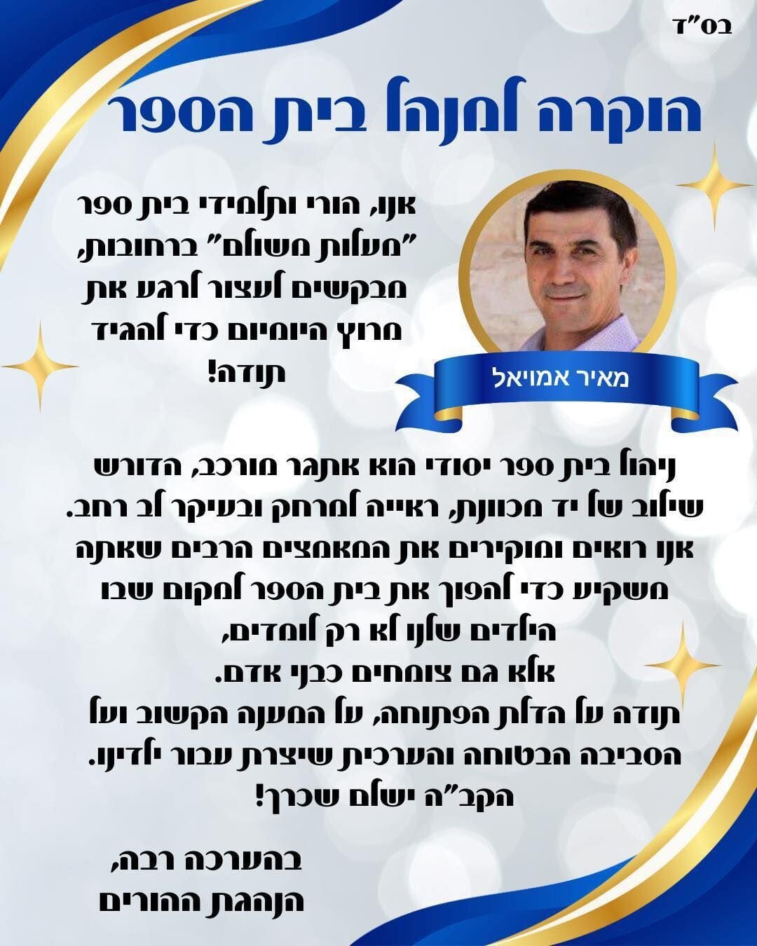 קהילת בית הספר מעלות משולם ברחובות ציינה את "יום המנהל" במחווה מיוחדת למנהל המוסד, מאיר אמויאל.