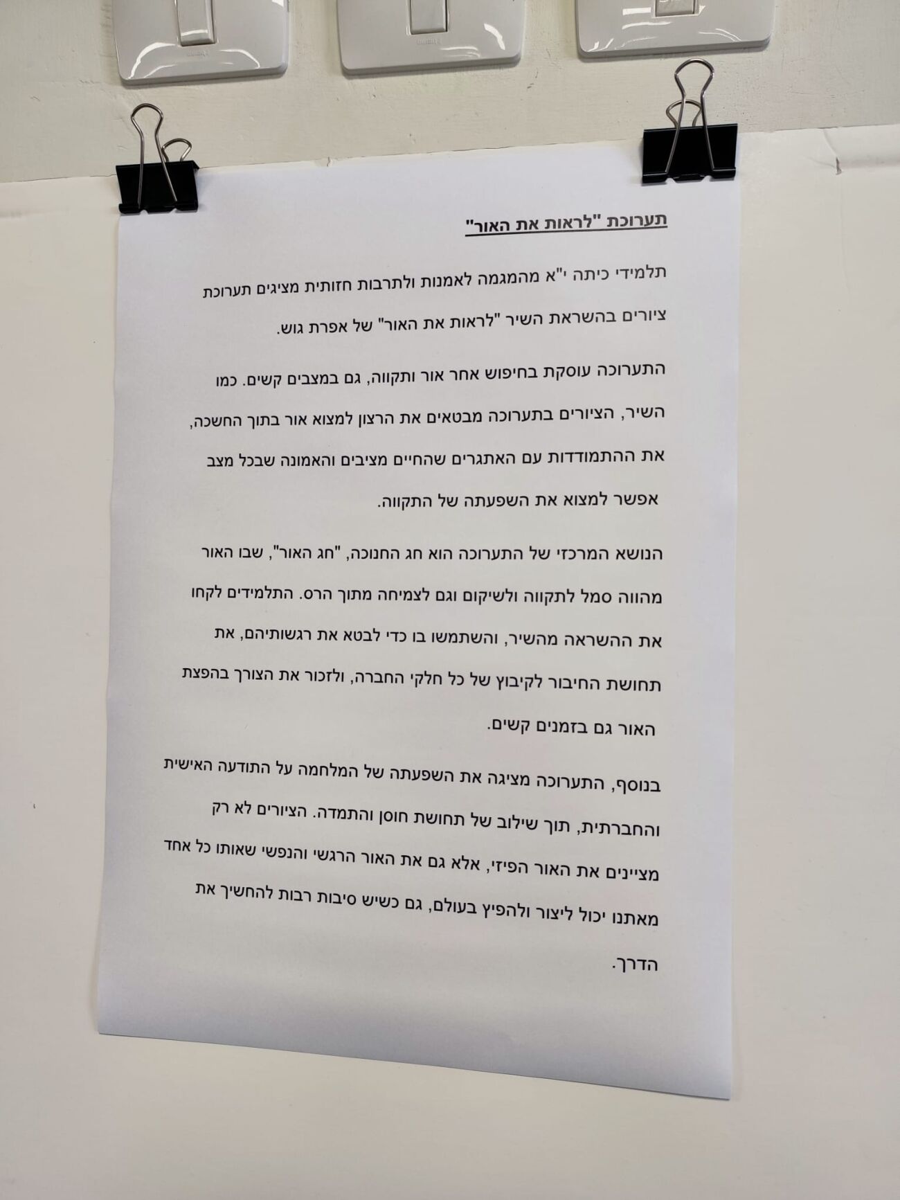 בימים אלו מוצגת בקריית החינוך דה שליט תערוכה מיוחדת ״לראות את האור״ - תערוכת של תלמידי שכבה יא מגמת אמנות, בהשראת שירה של אפרת גוש.