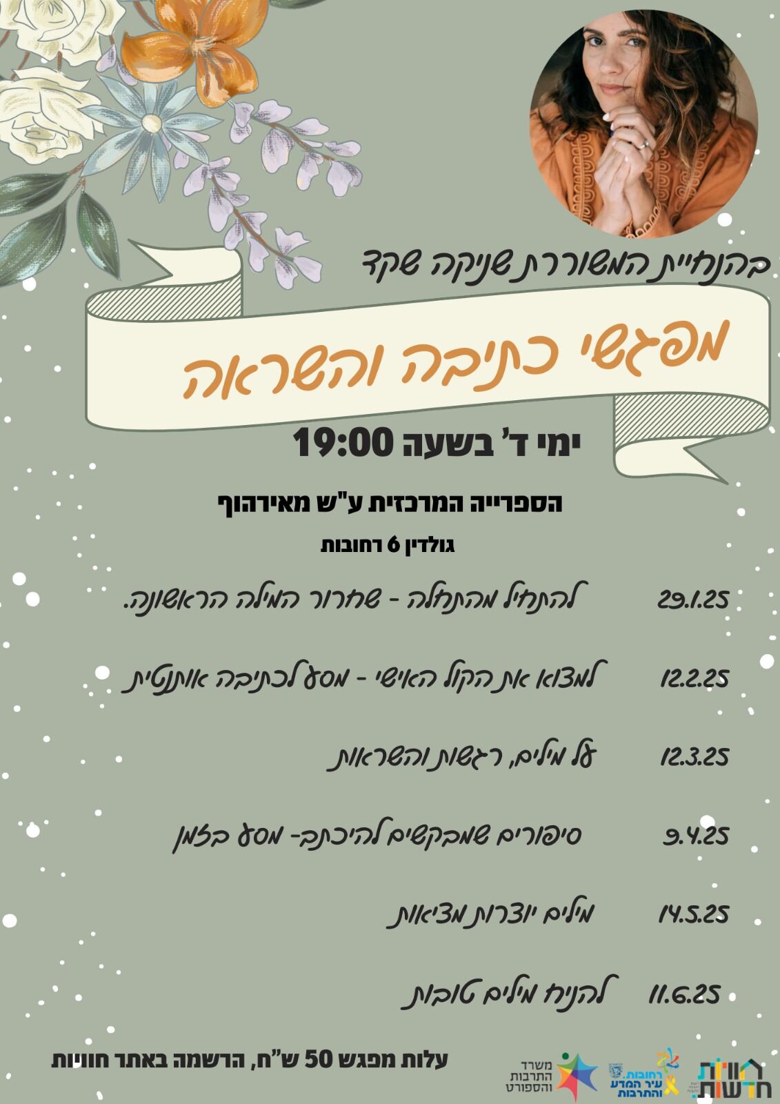 מתי? ימי רביעי החל מ29.1.25 בשעה 19:00 בספרייה המרכזית ע"ש מאירהוף, רח' גולדין 6