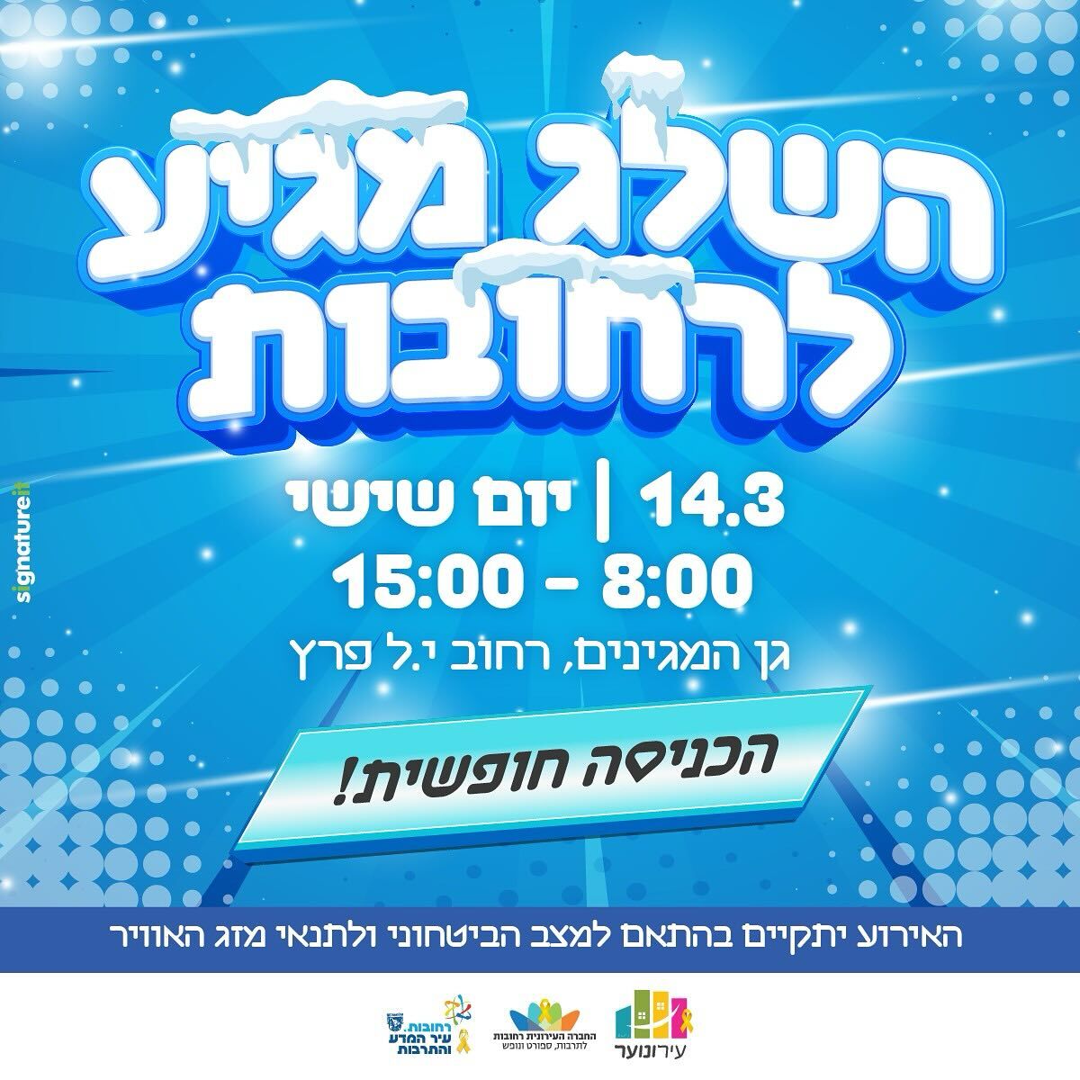 עיריית רחובות והחברה העירונית מזמינות את תושבות ותושבי העיר לחגיגת שלג בחופשת פורים, אשר תערך ביום שישי, 14.3, בין השעות 15:00-8:00 בגן המגינים בעיר, ברחוב י.ל פרץ. השלג יכרה מהרי החרמון המושלגים, יעשה את דרכו ויגיע בשעת בוקר מוקדמת לרחובות החמימה.