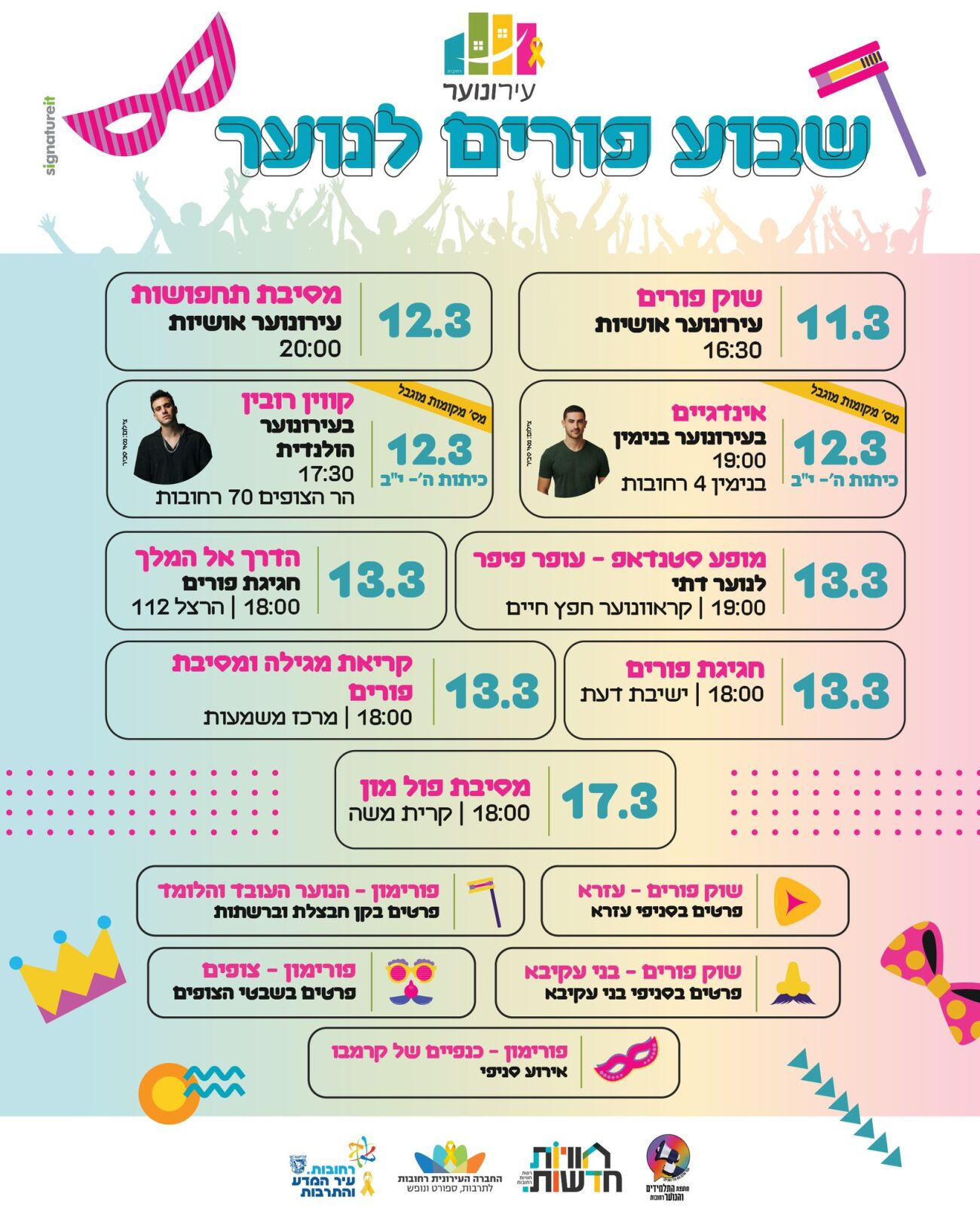 בנוסף לחגיגת השלג, יתקיימו במהלך השבוע בסניפי העירונוער בעיר שלל פעילויות ואירועים לבנות ולבני הנוער, ביניהם: מפגשים עם כוכבי הרשת אינדגיים בסניף עירונוער בנימין ועם קווין רובין בסניף עירונוער בהולנדית. כמו כן, ייהנו בנות ובני הנוער גם ממופע סטנדאפ של עופר פיפר בקראוונוער חפץ חיים, מסיבת פול-מון בסניף עירונוער בקרית משה, מסיבת תחפושות ושוק פורים בסניף עירונוער באושיות. כן יתקיימו מגוון פעילויות לפורים בתנועות הנוער עזרא, הנוער העובד והלומד, הצופים, בני עקיבא וכנפיים של קרמבו.