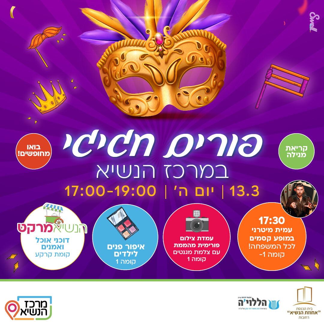 במרכז השכונתי תחכה לתושבים חגיגת פורים מיוחדת הכוללת: עמדת איפור פנים לילדים, עמדת צילום מגנטים פורימית במיוחד.