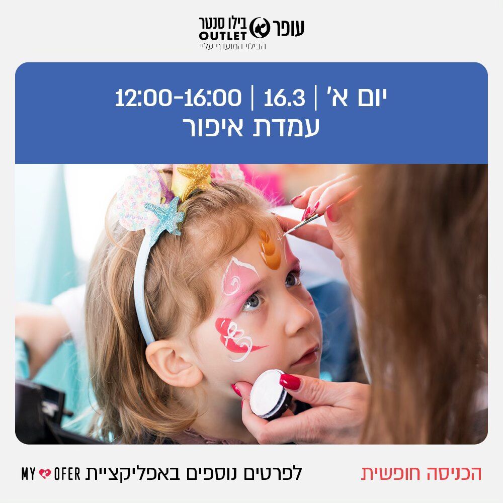 ראשון | 16.3.25 | ט"ז אדר | 17:00 | לגילאי 3-6 | ₪25 - ילד, ₪45 - 2 ילדים, ₪65 - 3 ילדים