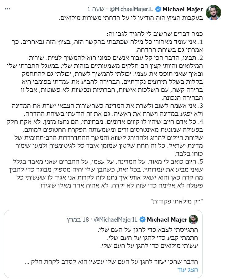 מיכאל מאייר, קצין במילואים המשרת באגף המודיעין בצה"ל וסטודנט במכון וייצמן ברחובות כתב בטוויטר כי יסרב לקחת חלק בלחימה ומתח ביקורת חריפה וכתב כי יסרב לקחת חלק בלחימה בשירות חבורת בוגדים מטונפים.