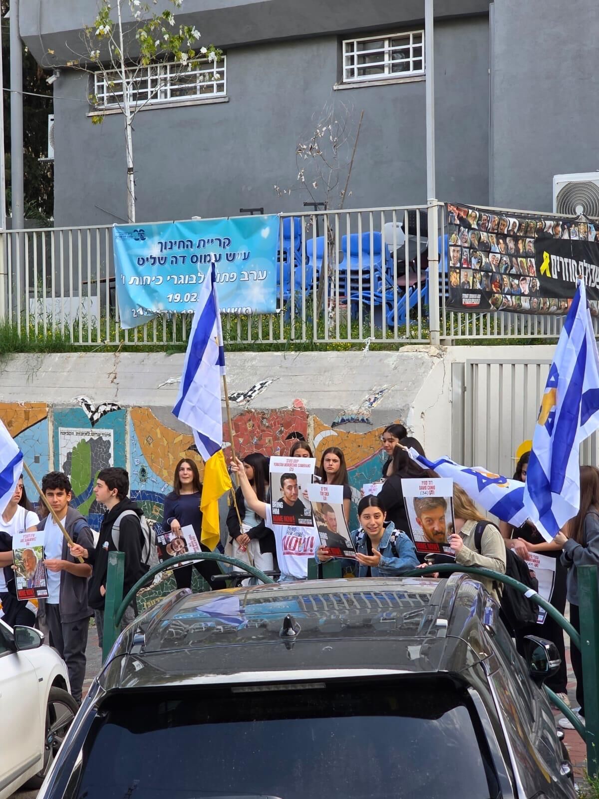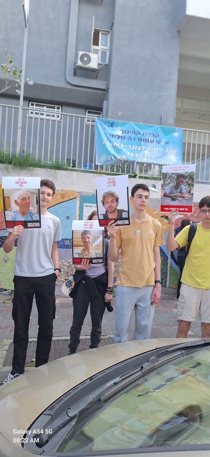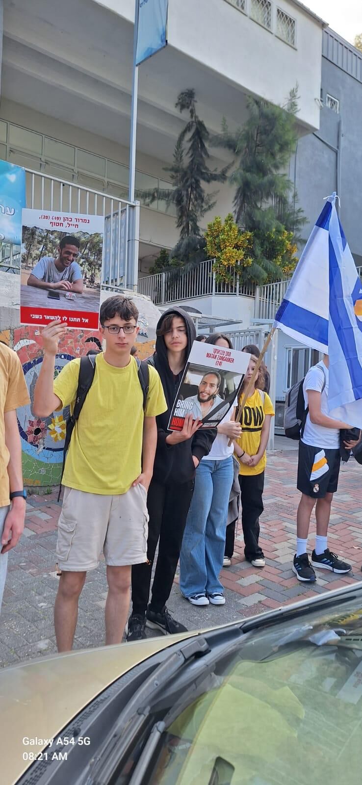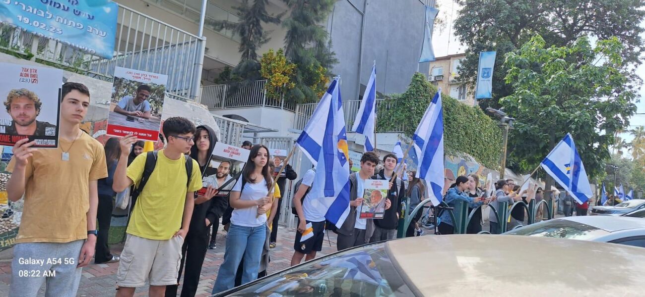 התלמידים והתלמידות עמדו בשער בית הספר ברחוב מנוחה ונחלה מ 8:00 עד 8:30 בקריאה להחזרת החטופים.