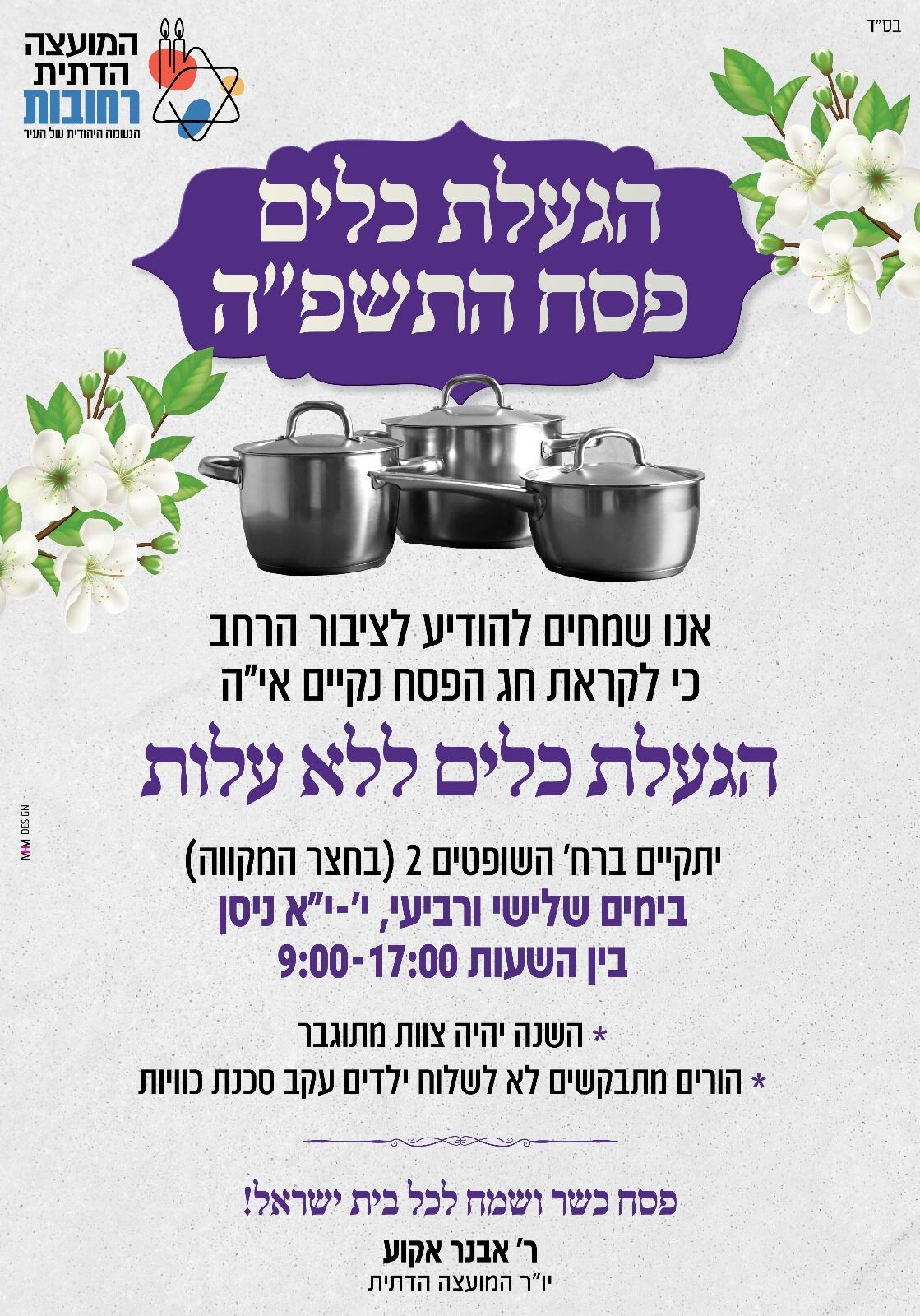 ניתן יהיה לבצע הגעלת כלים ברחוב השופטים 2 - רחבת המקווה בימים שלישי ורביעי 8-9.4 בין השעות 9:00 ועד 17:00