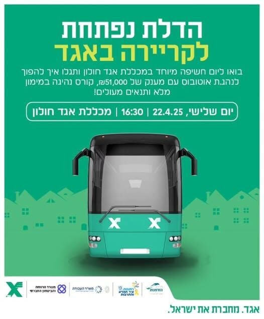 ביום שלישי, ה-22 באפריל 2025, יתקיים יום חשיפה מיוחד במכללת אגד חולון ללימוד נהיגה באוטובוס, בשיתוף עם מרכזי הזדמנות. האירוע יחל בשעה 16:30 ויכלול סיור חווייתי במכללה ובאוטובוס, הסבר על מסלול הלימודים וההכשרה להוצאת רישיון נהיגת אוטובוס, וכן מענה לשאלות בנושאי תנאים, שעות עבודה ושכר.