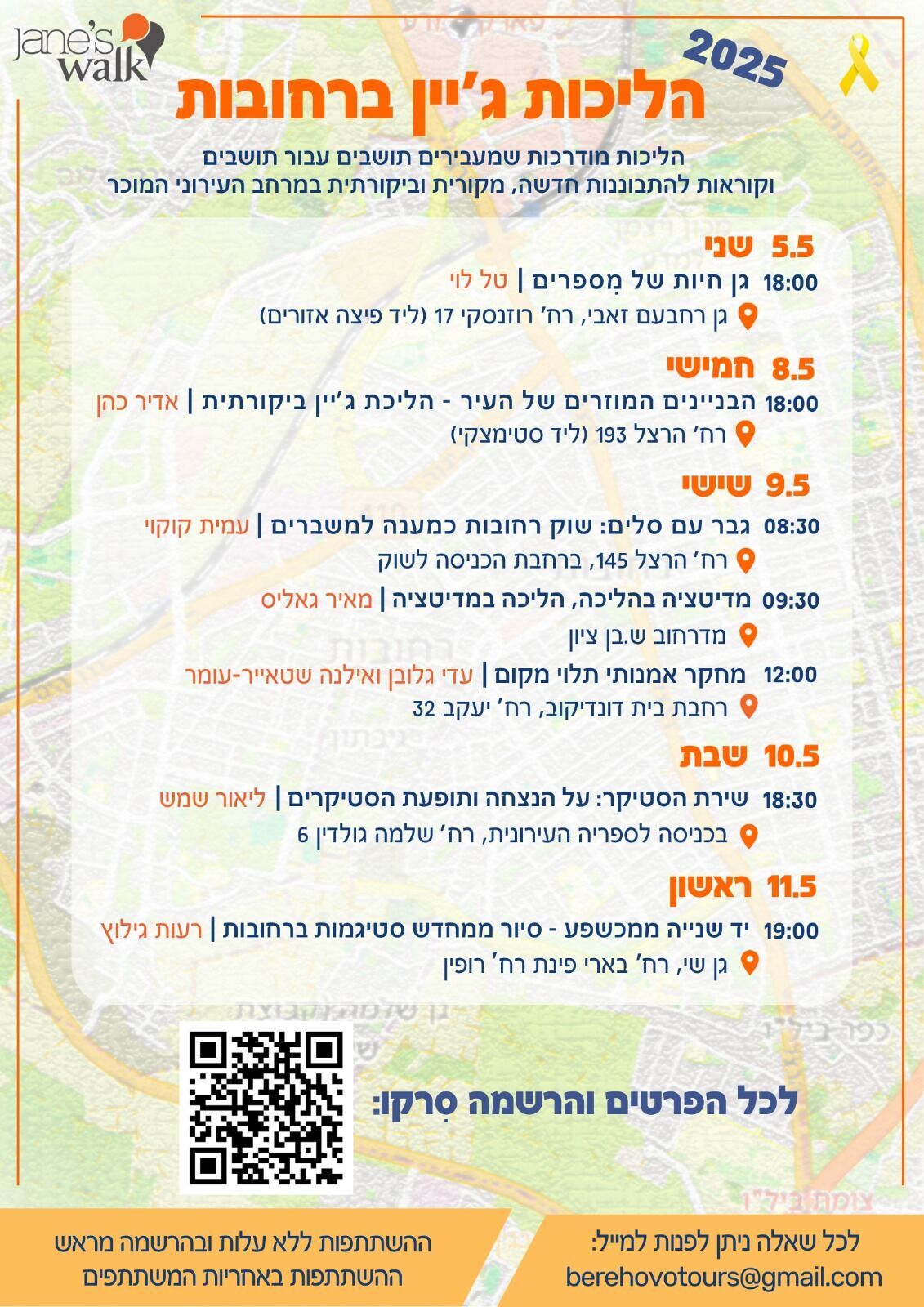 פרויקט 'הליכות ג'יין' חוזר לרחובות: סיורים מודרכים בחינם על ידי תושבים יתקיימו בין התאריכים 5-11.5.25 להכרת העיר רחובות, דרך הרגליים. להרשמה לסיורים השונים בלינק בכתבה