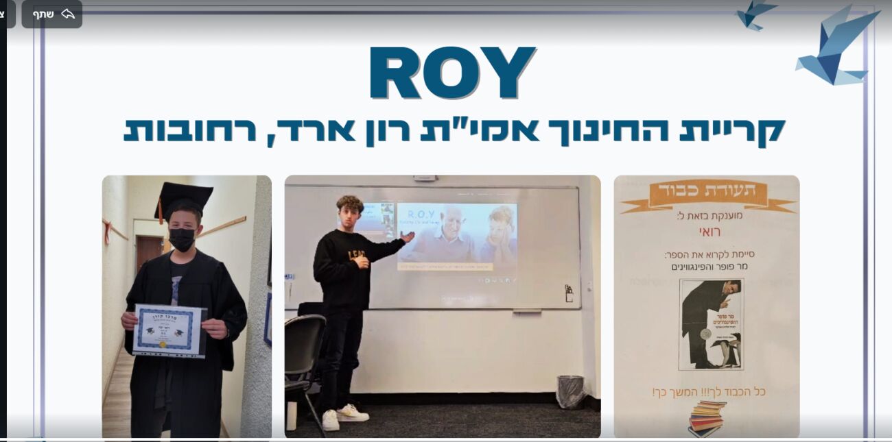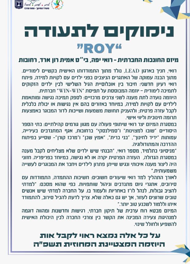 רואי חניך בארגון LEAD, לאור התמודדותו האישית בקשיים לימודיים הוא פיתח רעיון חדשני חיבור בין אוכלוסיות הגיל השלישי לבין ילדים הזקוקים לתמיכה לימודית. במסגרת המיזם הוא יצר שיתופי פעולה עם בתי הפר היסודיים סמילנסקי ושובו למצויינות, אגף המתנדבים העירוני, עמותות ידיד לחינוך, בני ברית, אמץ שכן, ומרכז קורן שסייע בפיתוח ההדרכה והמתודולוגיה. בנימוקים לבחירה נכתב: המיזם מבטא רוח ערכית של תיקון חברתי, רגישות וחדשנות ומהווה דוגמה למנהיגות צעירה המבינה את הקשר בין צורכי החברה לבין היכולת האישית להשפיע ולחולל שינוי.