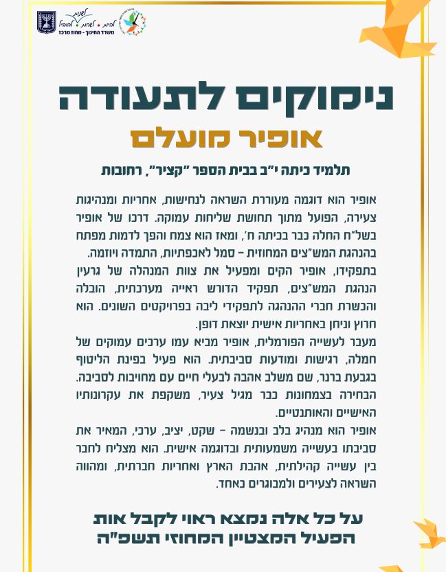 אופיר מועלם תלמיד כיתה יב בבית ספר קציר רחובות