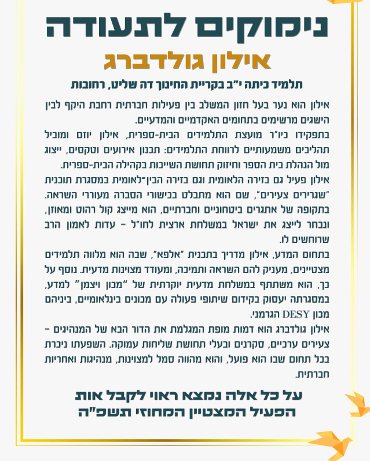 תלמידי בתי הספר דה שליט, קציר ואמית רון ארד ברחובות: אילון גולדברג, אופיר מועלם ורואי יפה קבלו את אות הפעיל המצטיין המחוזי